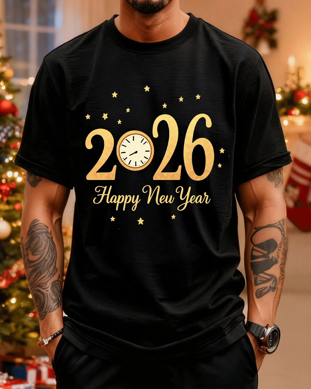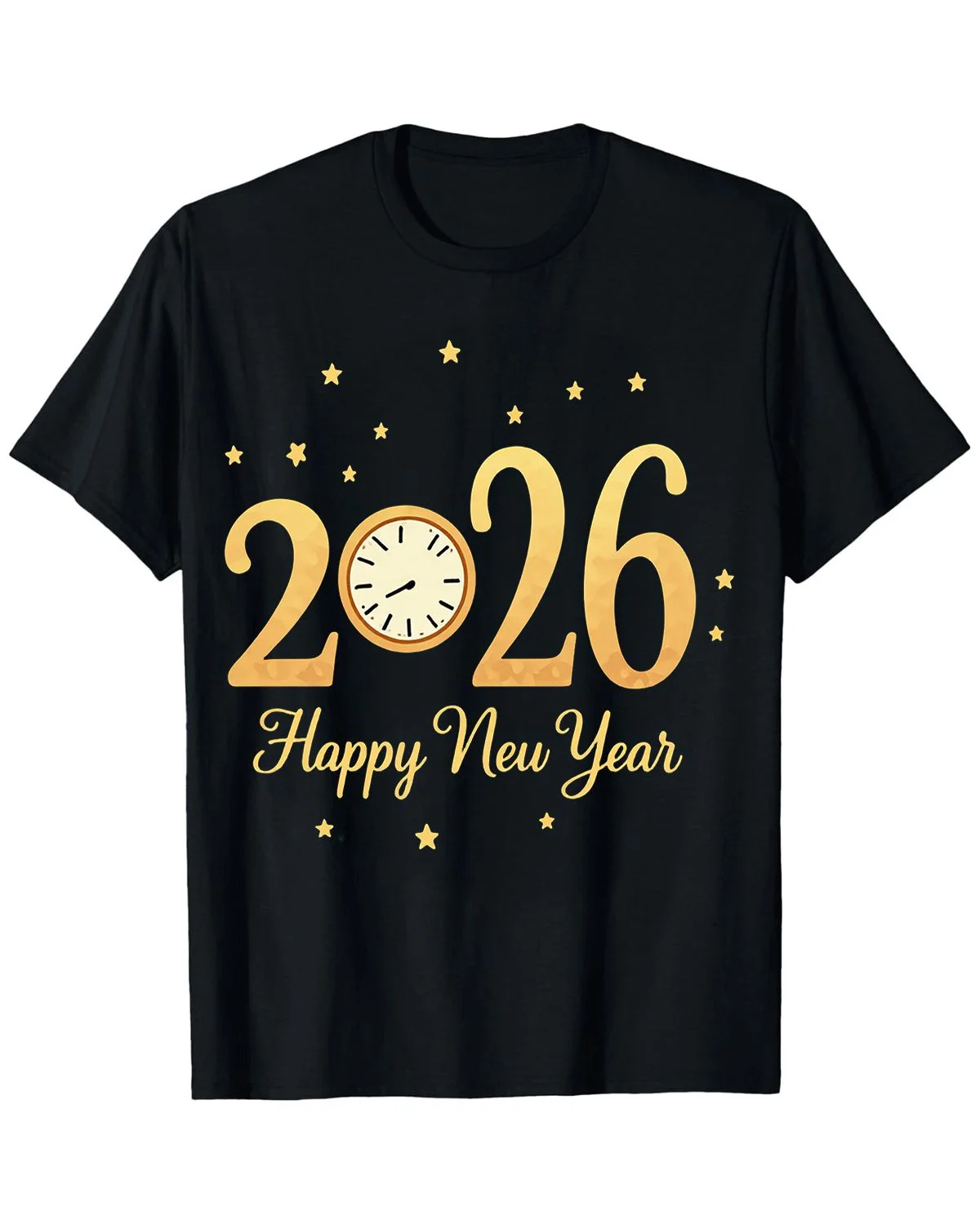 2026 Happy New Year Clock and Stars Summer Cotton Graphic T Shirt - Casual Vintage, Short Sleeve, Soft Fabric, Comfortable Fit