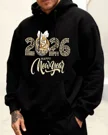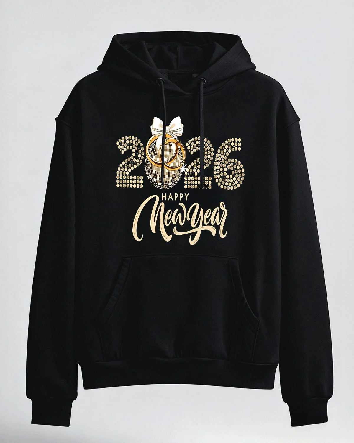 2026 Happy New Year Disco Ball and Rings Cozy Graphic Hoodie for Men and Women - Classic Chic, Long Sleeve, Soft Fabric, Comfortable Fit