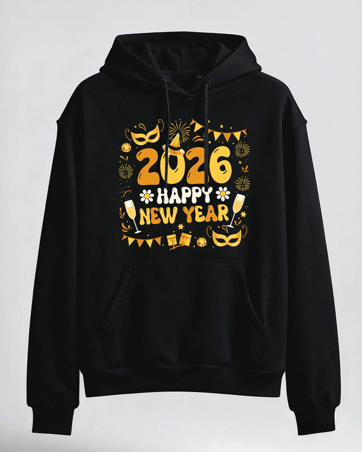 2026 Happy New Year Fireworks and Masks Cozy Graphic Hoodie for Men and Women - Casual Vintage, Long Sleeve, Soft Fabric, Comfortable Fit