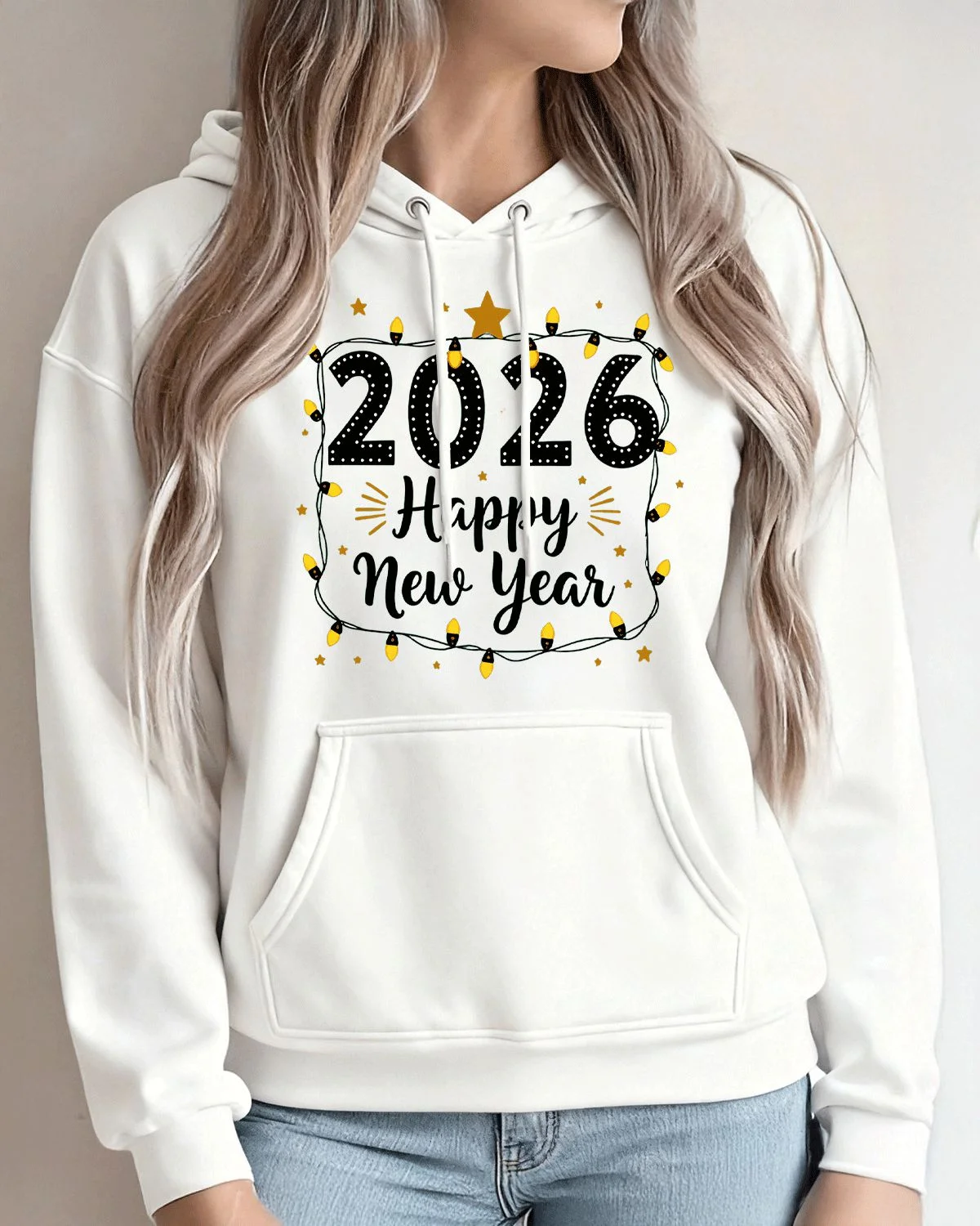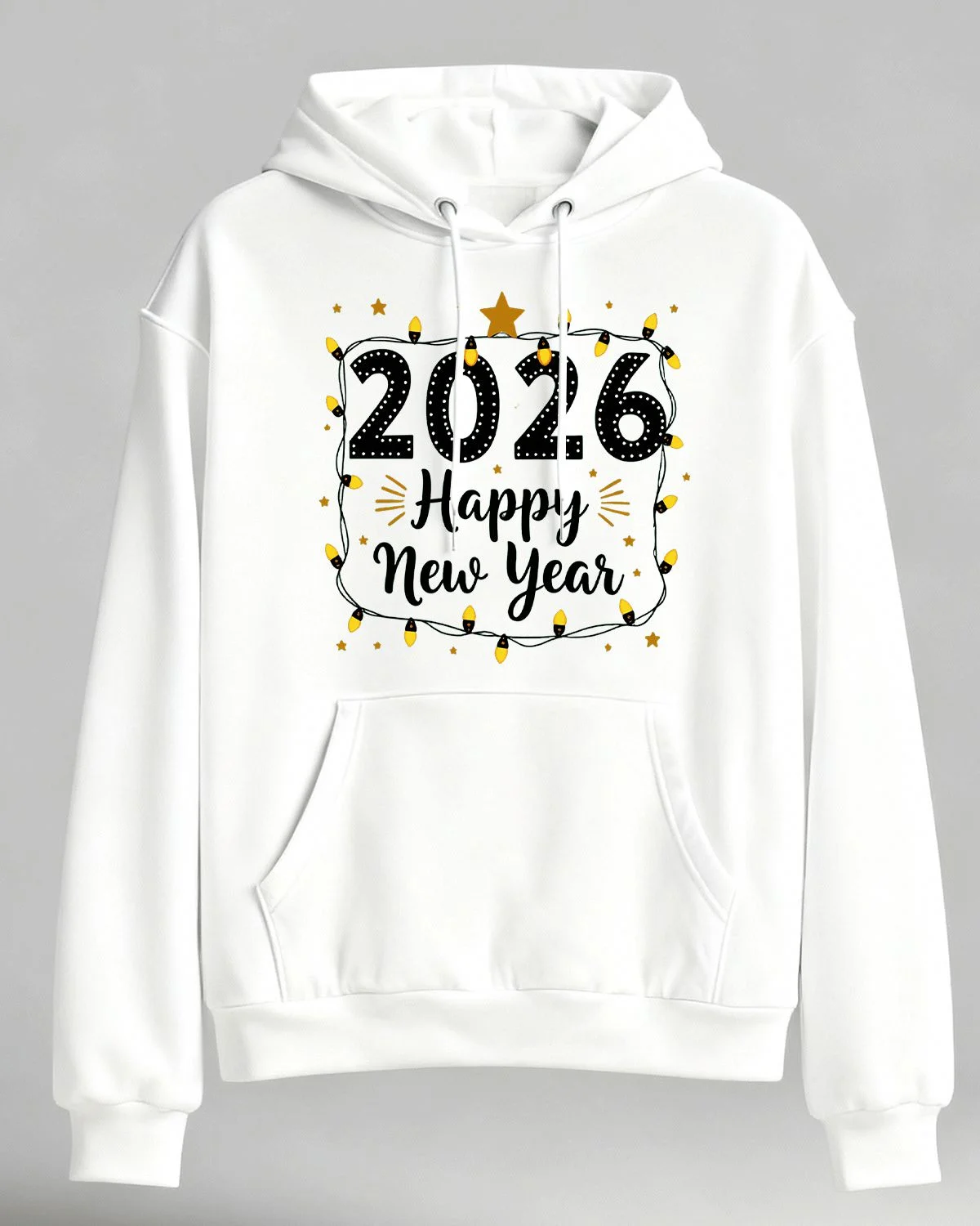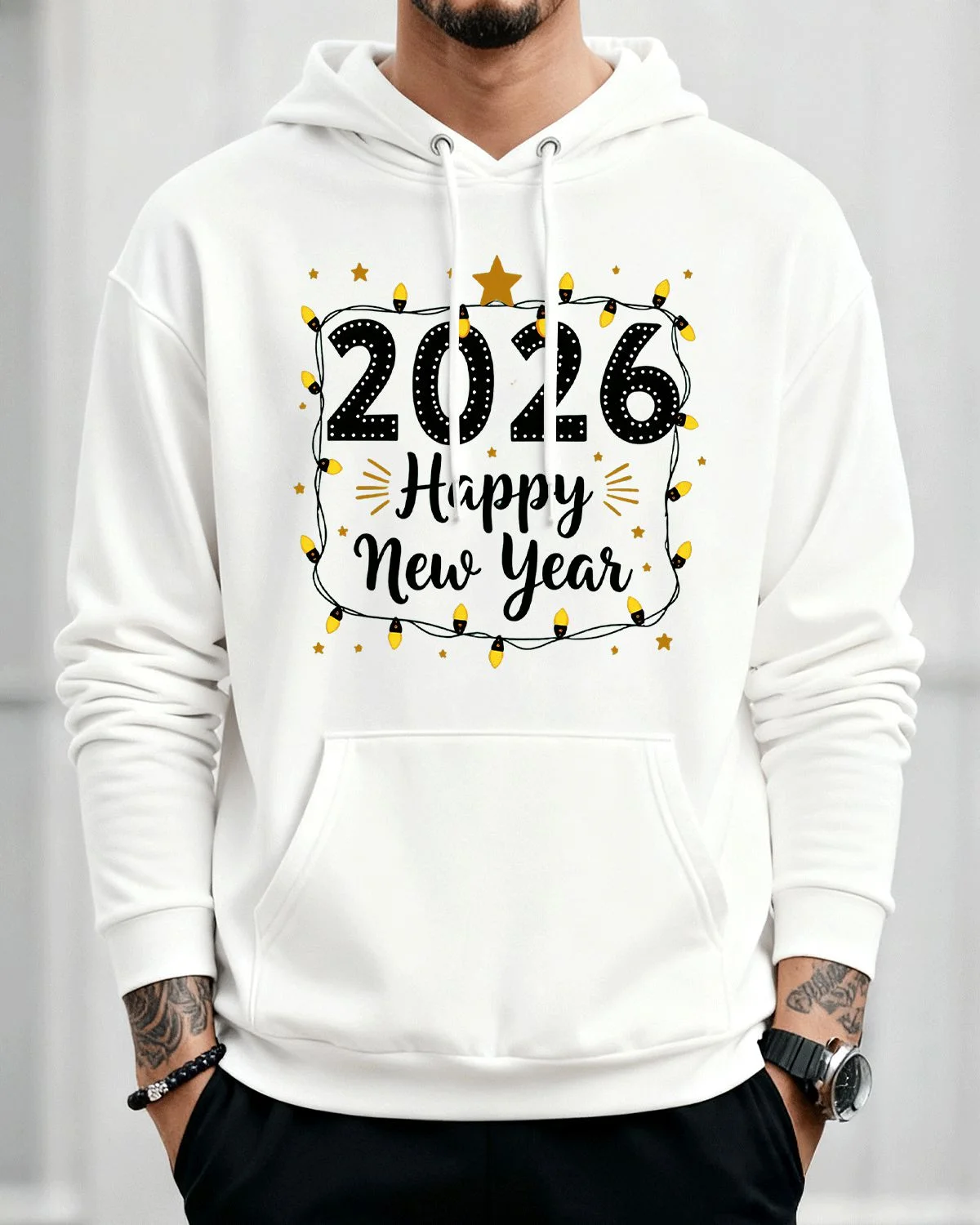 2026 Happy New Year Lights and Stars Cozy Graphic Hoodie for Men and Women - Casual Vintage, Long Sleeve, Soft Fabric, Comfortable Fit