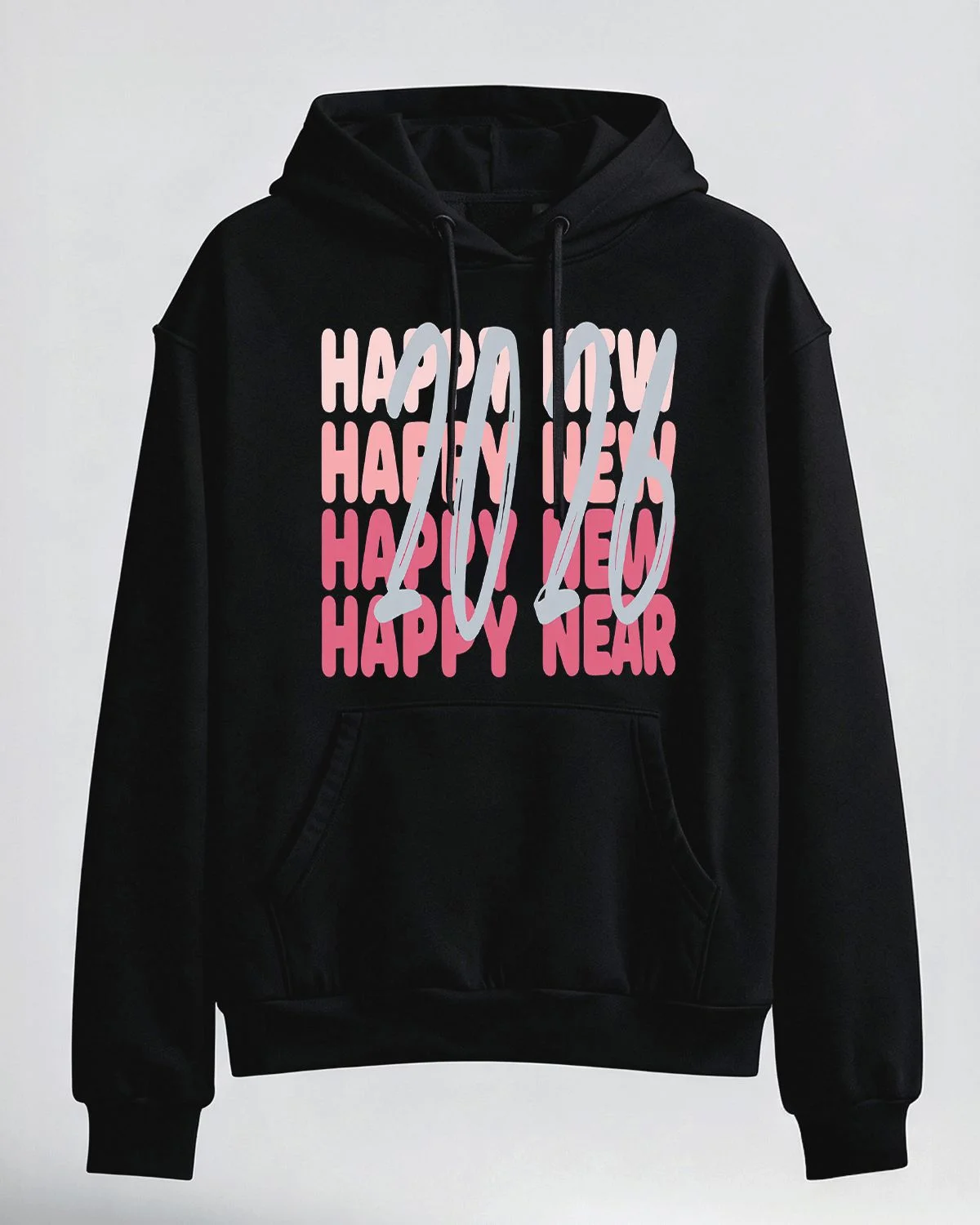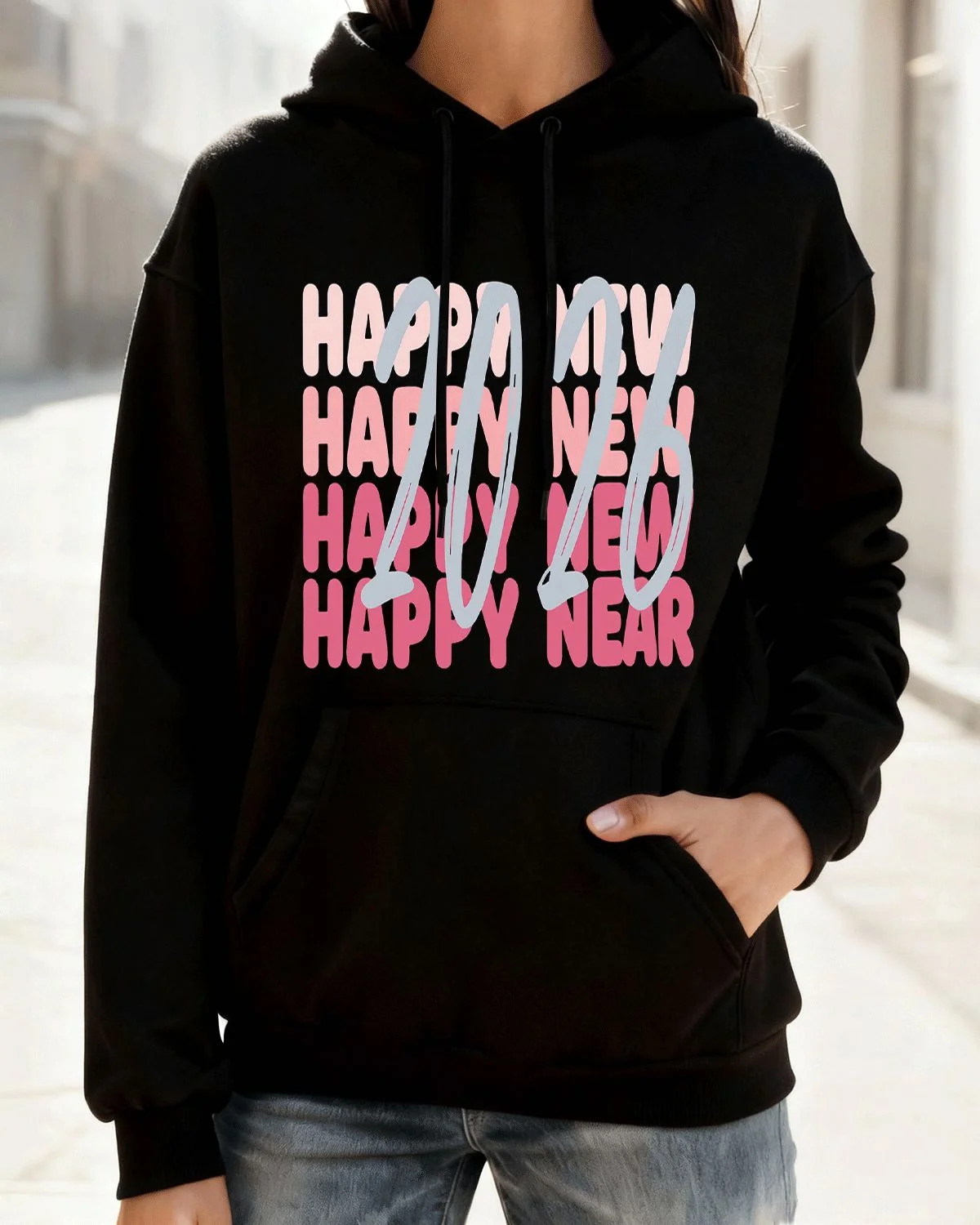 2026 Happy New Year Pink Gradient Text Cozy Graphic Hoodie for Men and Women - Casual Retro, Long Sleeve, Soft Fabric, Comfortable Fit