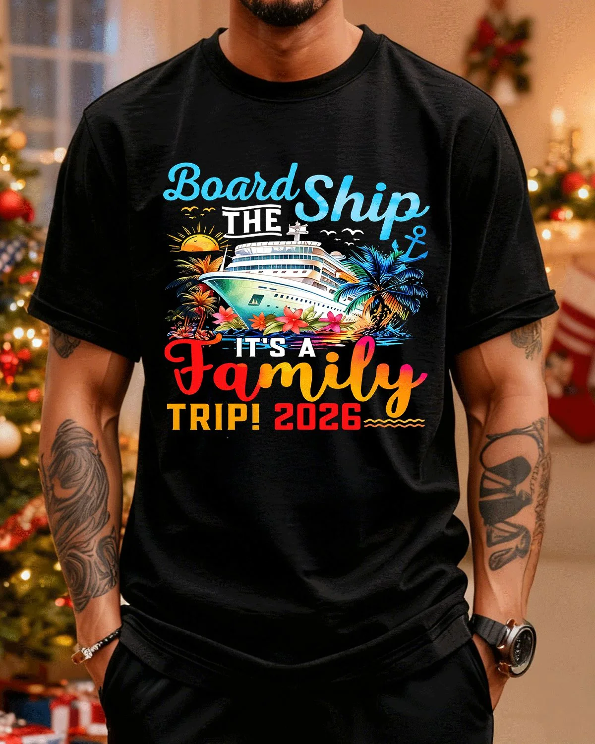 2026 New Year Board the Ship Family Trip Summer Cotton Graphic T Shirt - Casual Graphic, Short Sleeve, Soft Fabric, Comfortable Fit