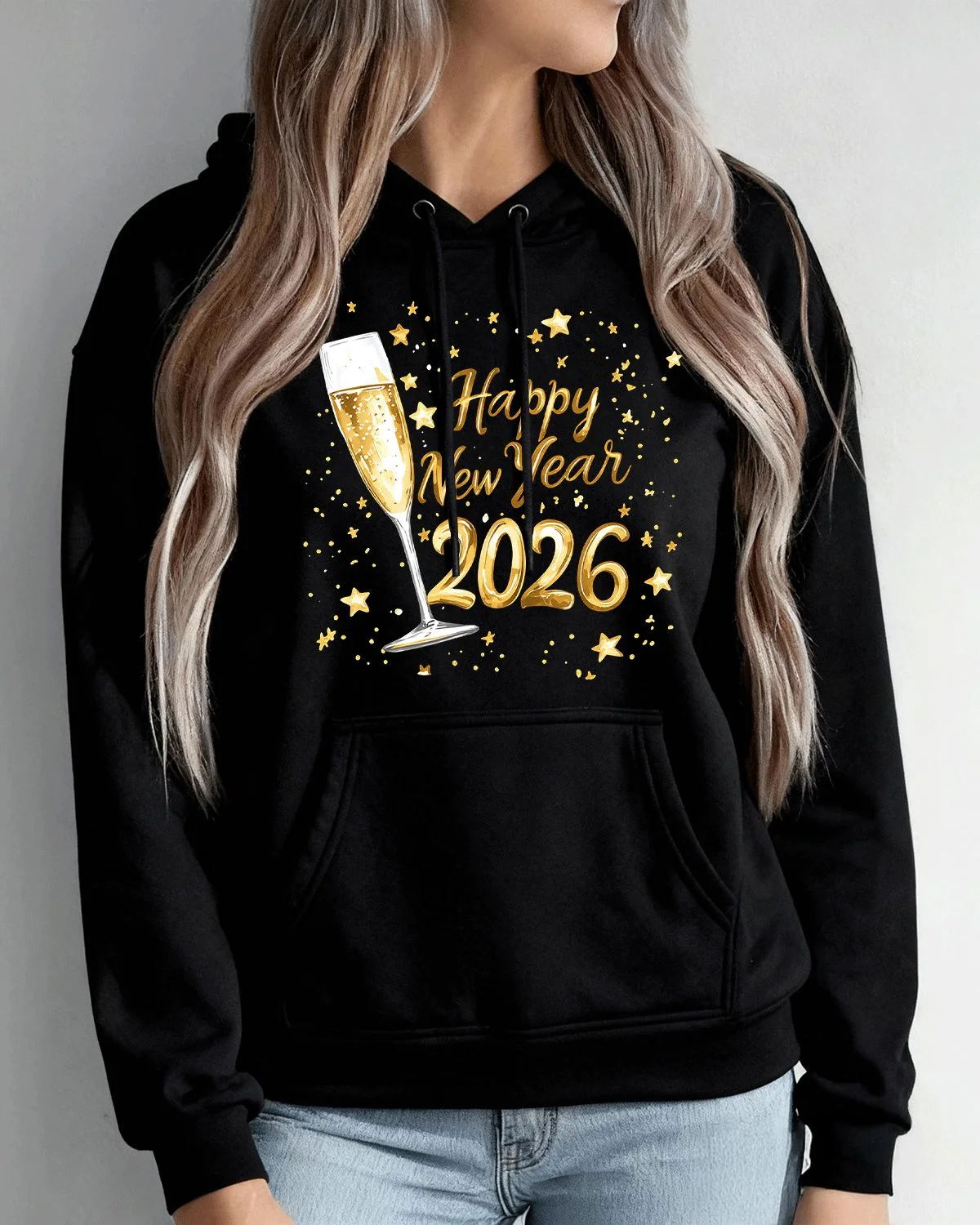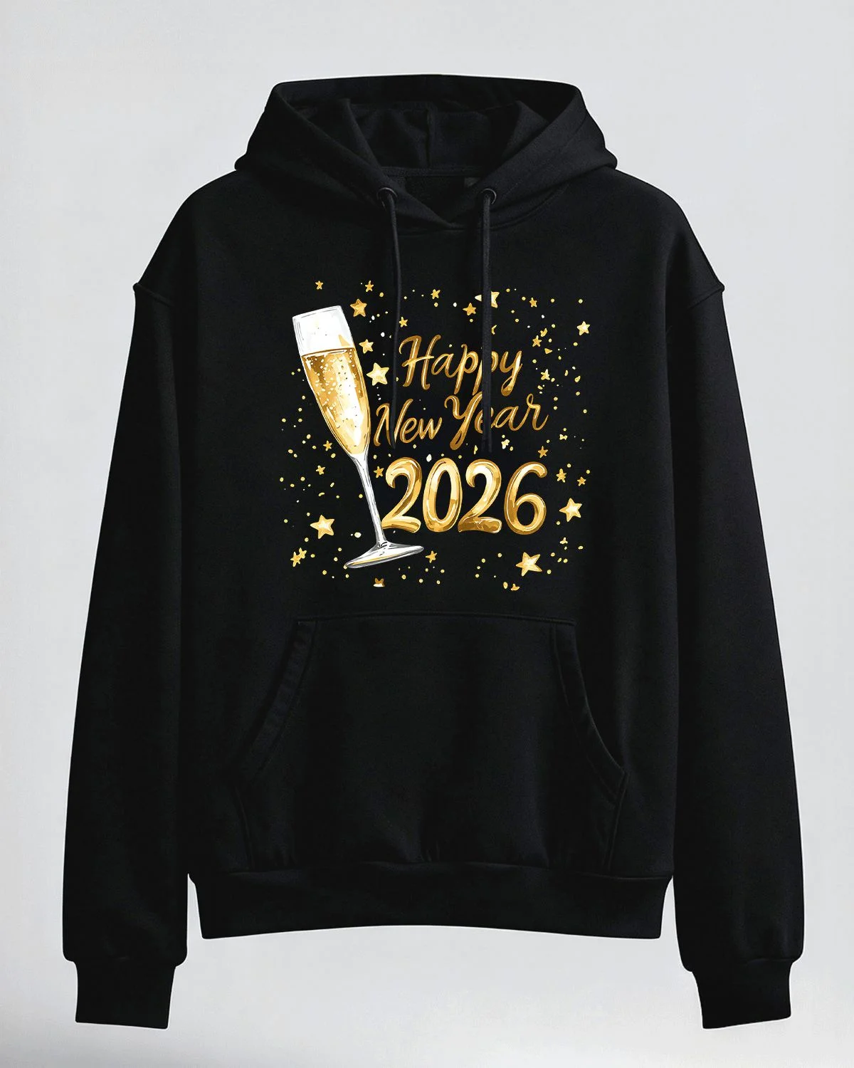 2026 New Year Champagne Glass and Gold Stars Cozy Graphic Hoodie for Men and Women - Classic Vintage, Long Sleeve, Soft Fabric, Comfortable Fit