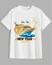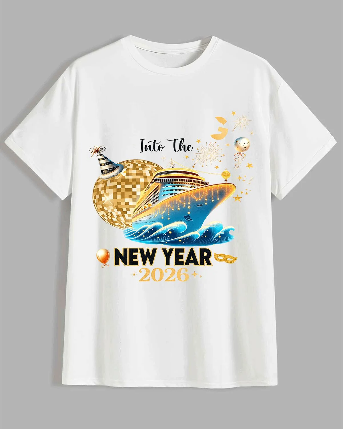 2026 New Year Cruise Ship and Fireworks Summer Cotton Graphic T Shirt - Vintage Artistic, Short Sleeve, Soft Fabric, Comfortable Fit