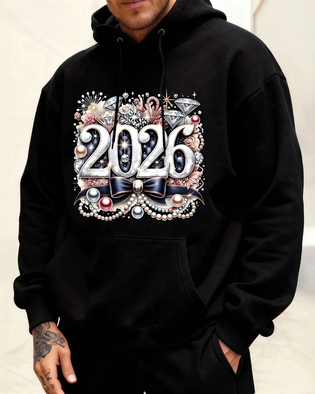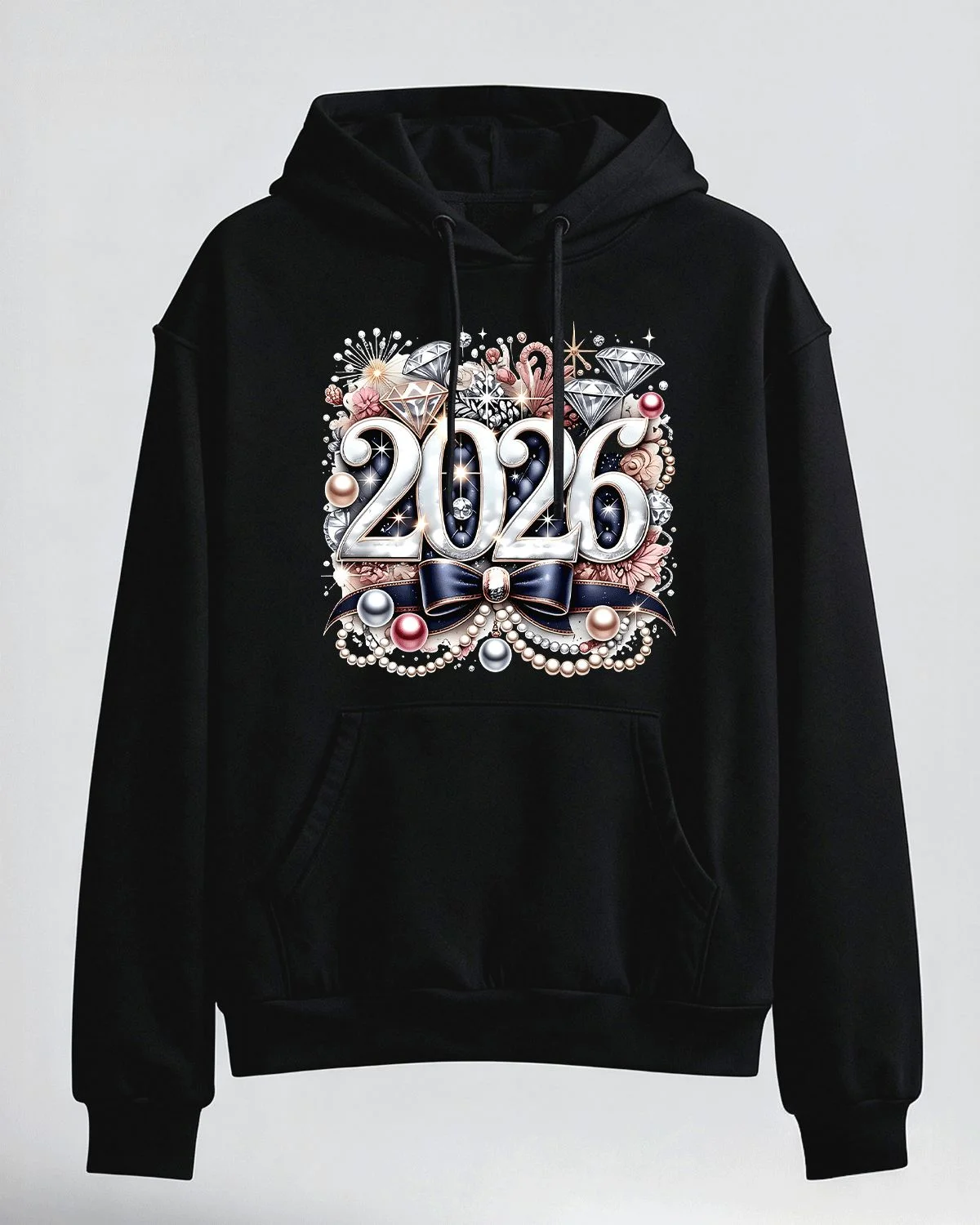 2026 New Year Diamonds and Pearls Bow Cozy Graphic Hoodie for Men and Women - Chic Vintage, Long Sleeve, Soft Fabric, Comfortable Fit