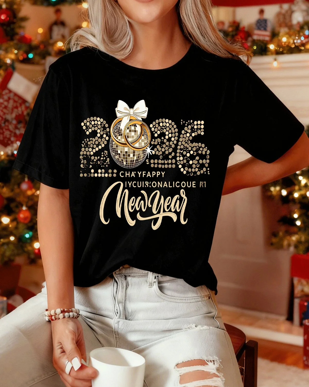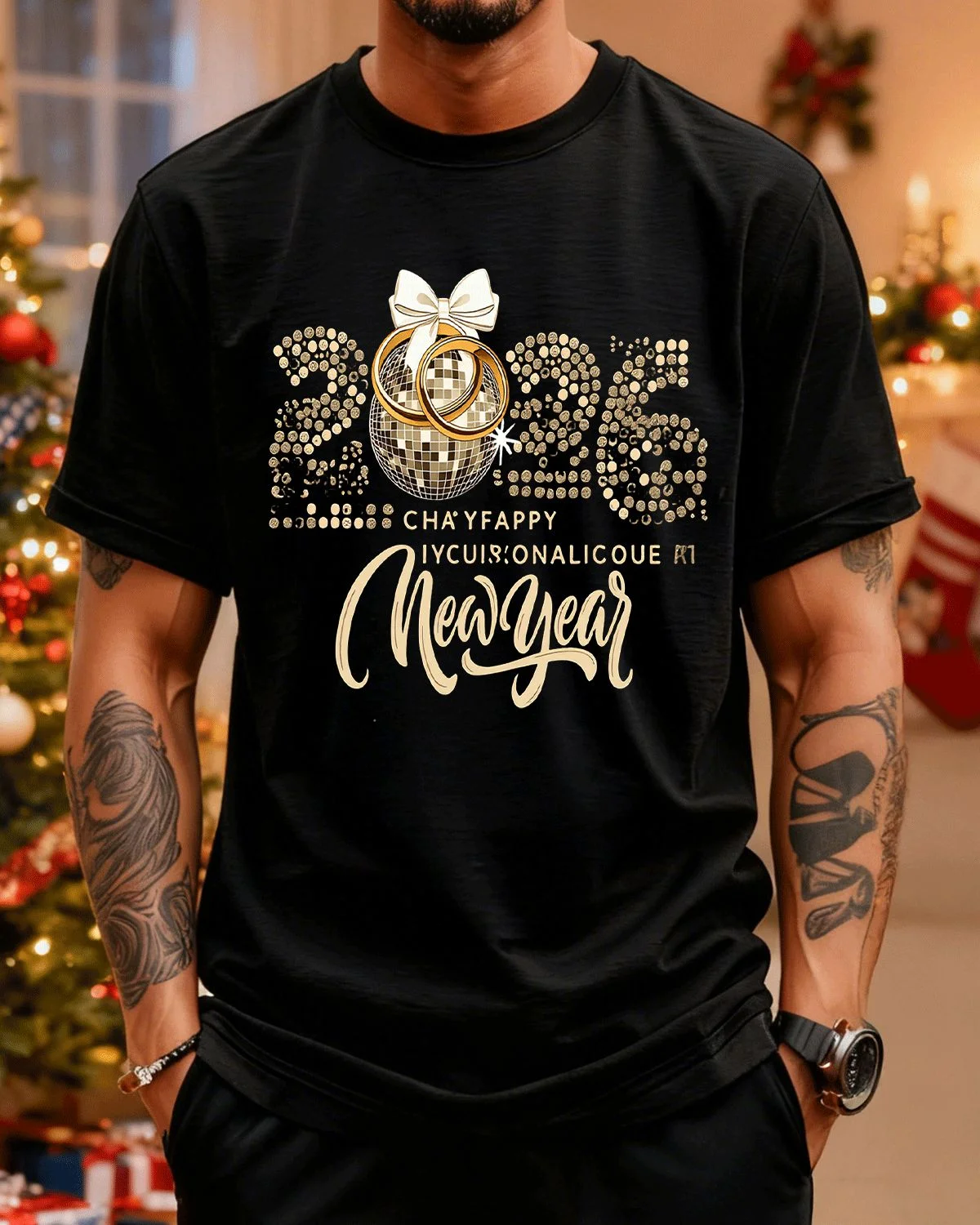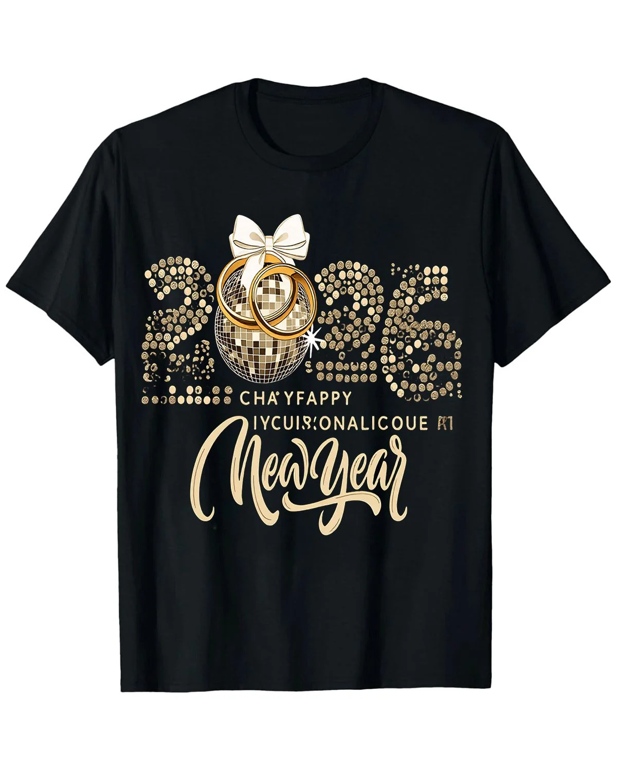 2026 New Year Disco Ball and Rings Summer Cotton Graphic T Shirt - Classic Vintage, Short Sleeve, Soft Fabric, Comfortable Fit
