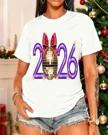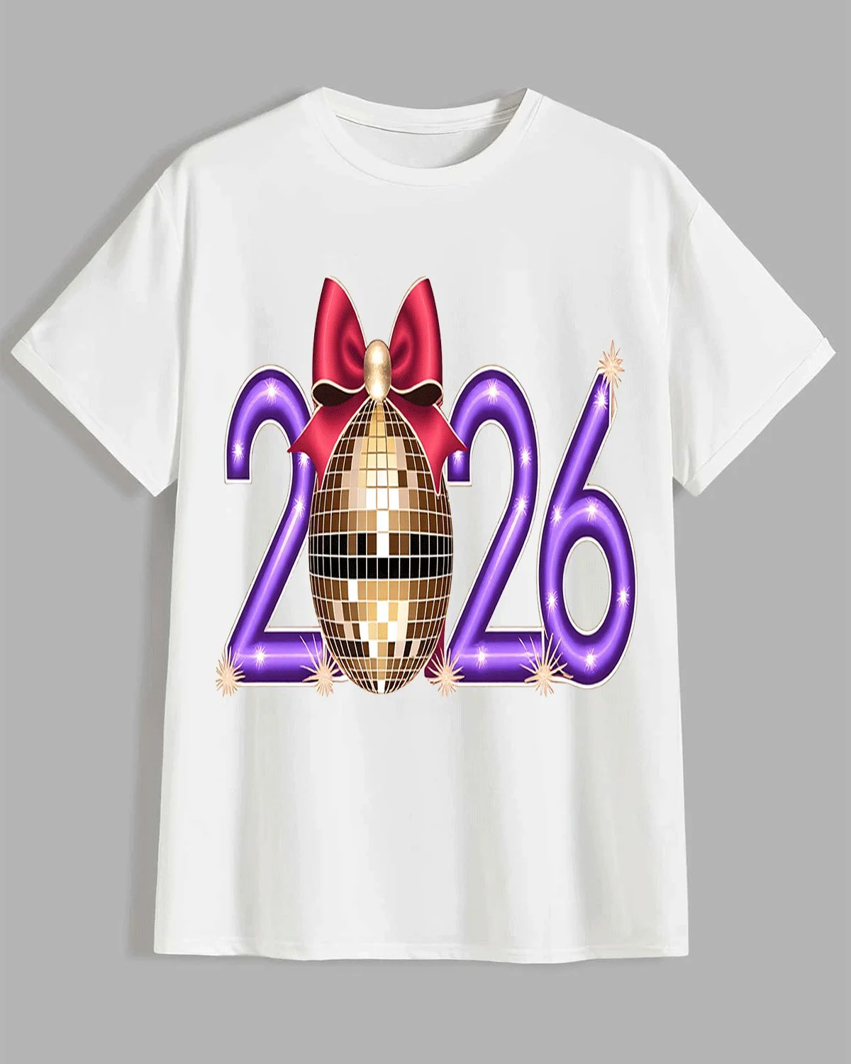 2026 New Year Disco Ball with Red Bow Summer Cotton Graphic T Shirt - Trendy Retro, Short Sleeve, Soft Fabric, Comfortable Fit