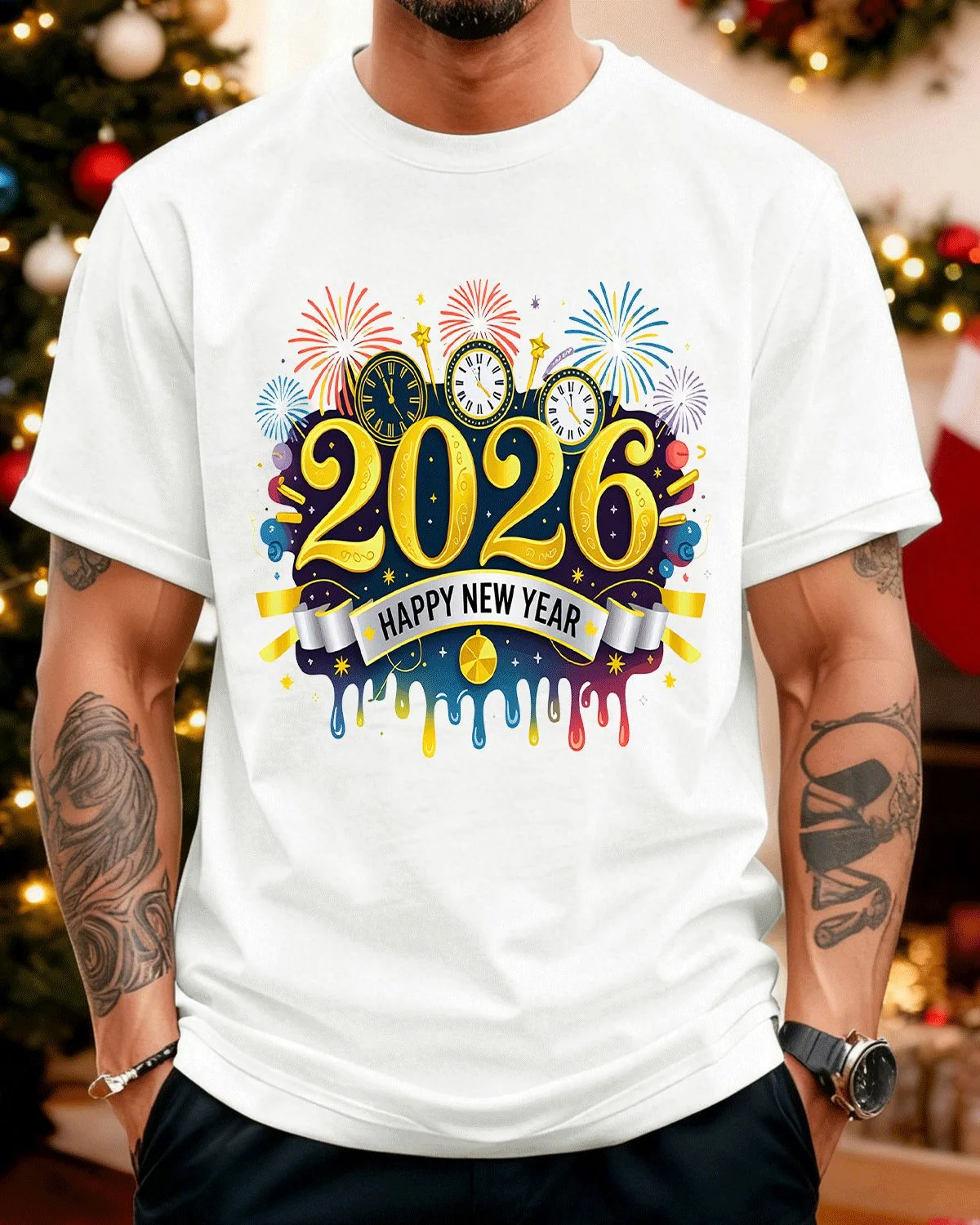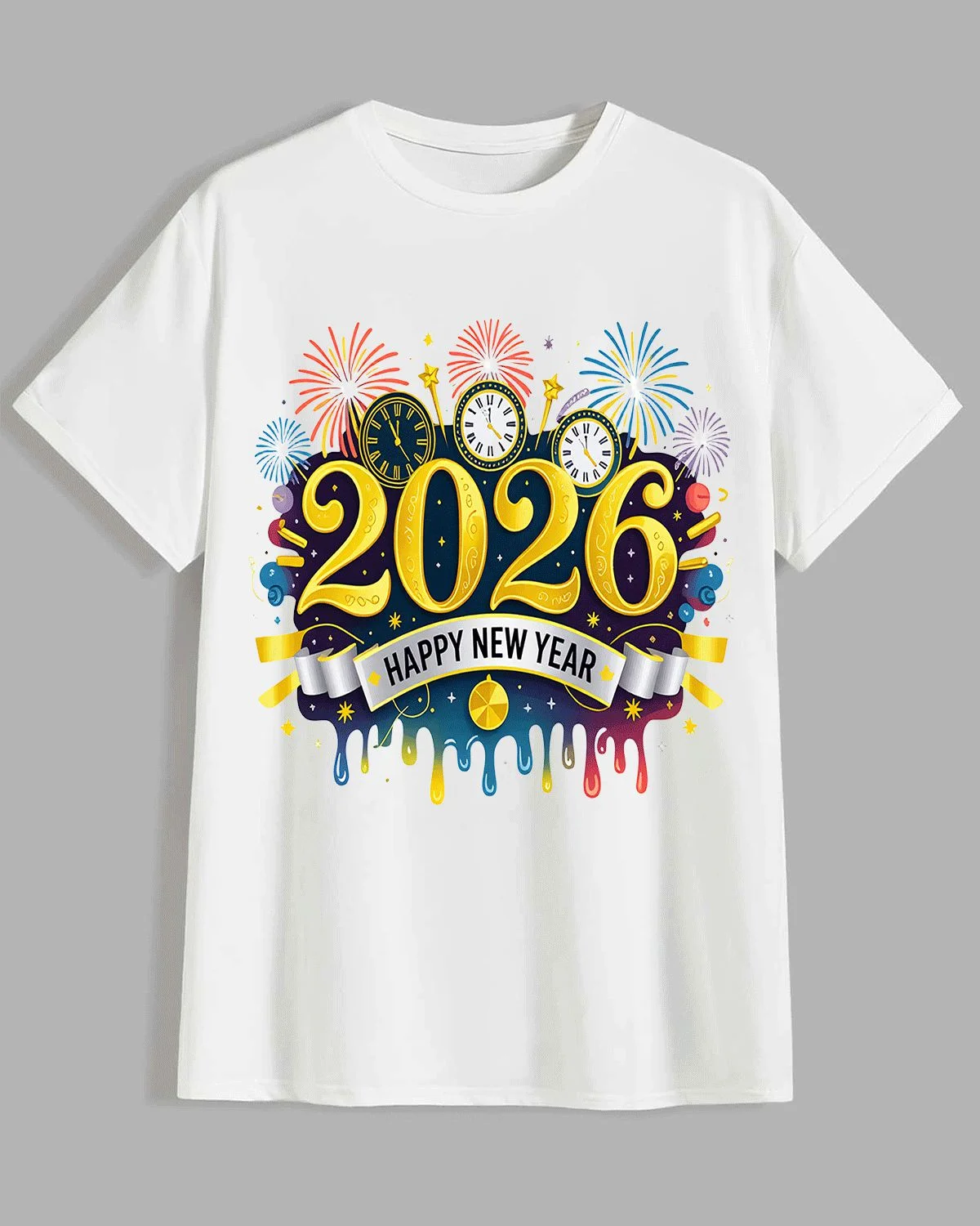 Happy New Year Fireworks and Streamers Summer Cotton Graphic T Shirt - Casual Vintage, Short Sleeve, Soft Fabric, Comfortable Fit