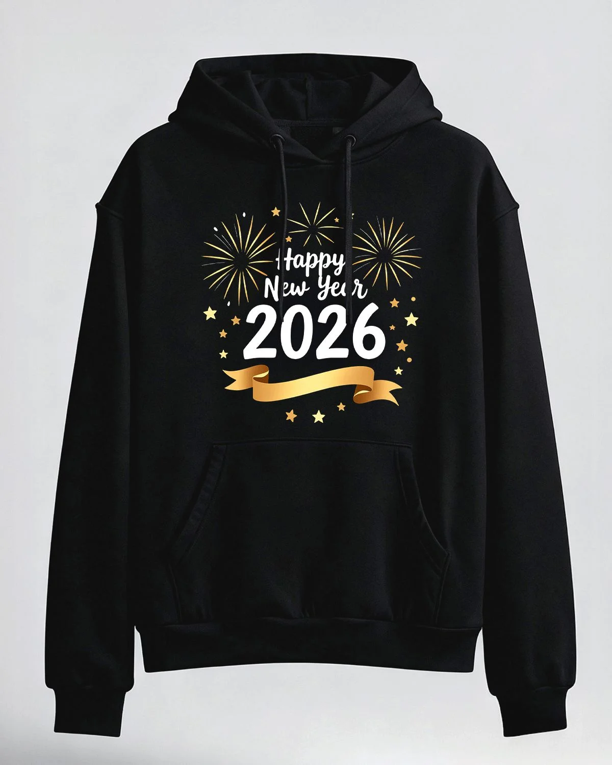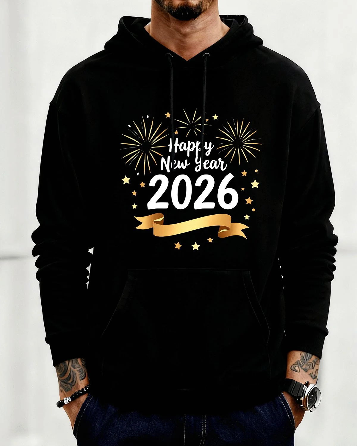 2026 New Year Fireworks and Gold Stars Cozy Graphic Hoodie for Men and Women - Casual Vintage, Long Sleeve, Soft Fabric, Comfortable Fit