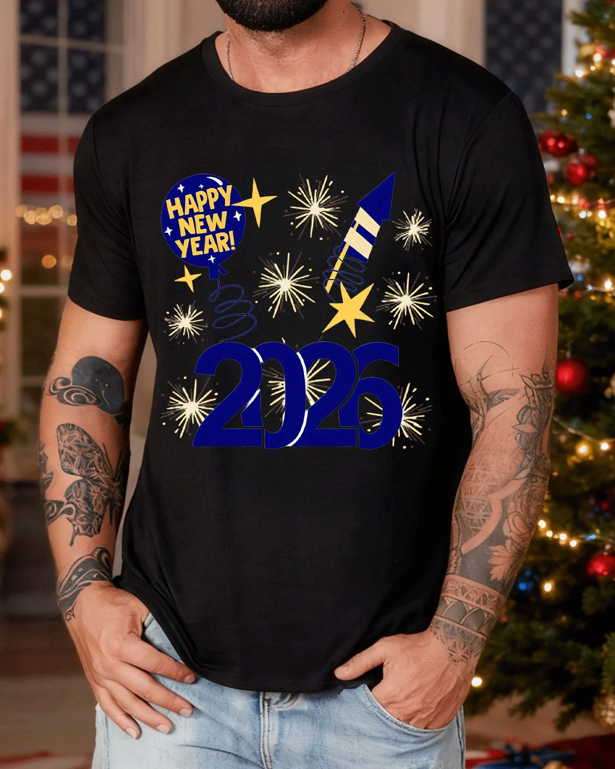2026 New Year Fireworks and Rocket Balloon Summer Cotton Graphic T Shirt - Casual Vintage, Short Sleeve, Soft Fabric, Comfortable Fit