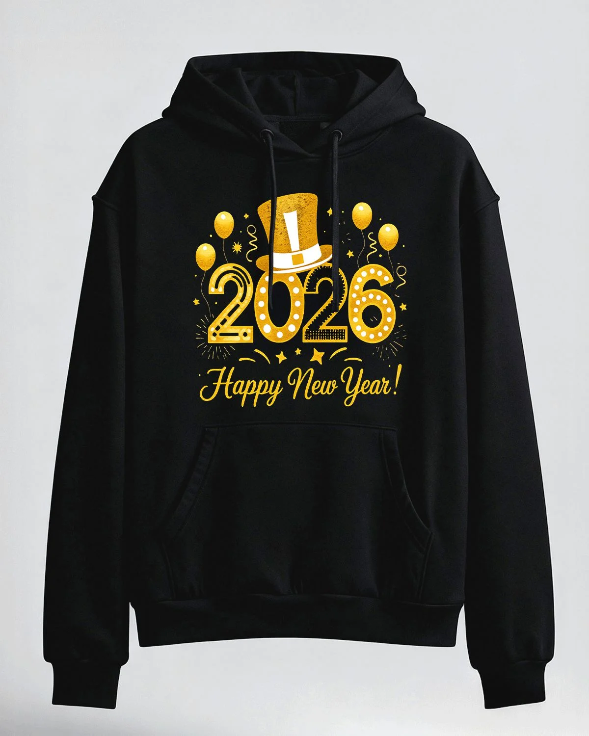 2026 New Year Gold Balloons and Top Hat Cozy Graphic Hoodie for Men and Women - Casual Vintage, Long Sleeve, Soft Fabric, Comfortable Fit