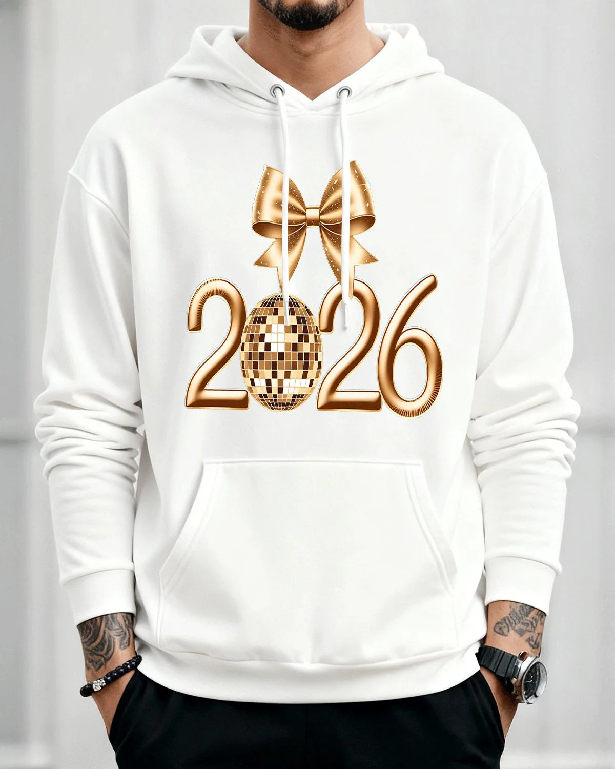 2026 New Year Gold Disco Ball and Bow Cozy Graphic Hoodie for Men and Women - Trendy Vintage, Long Sleeve, Soft Fabric, Comfortable Fit