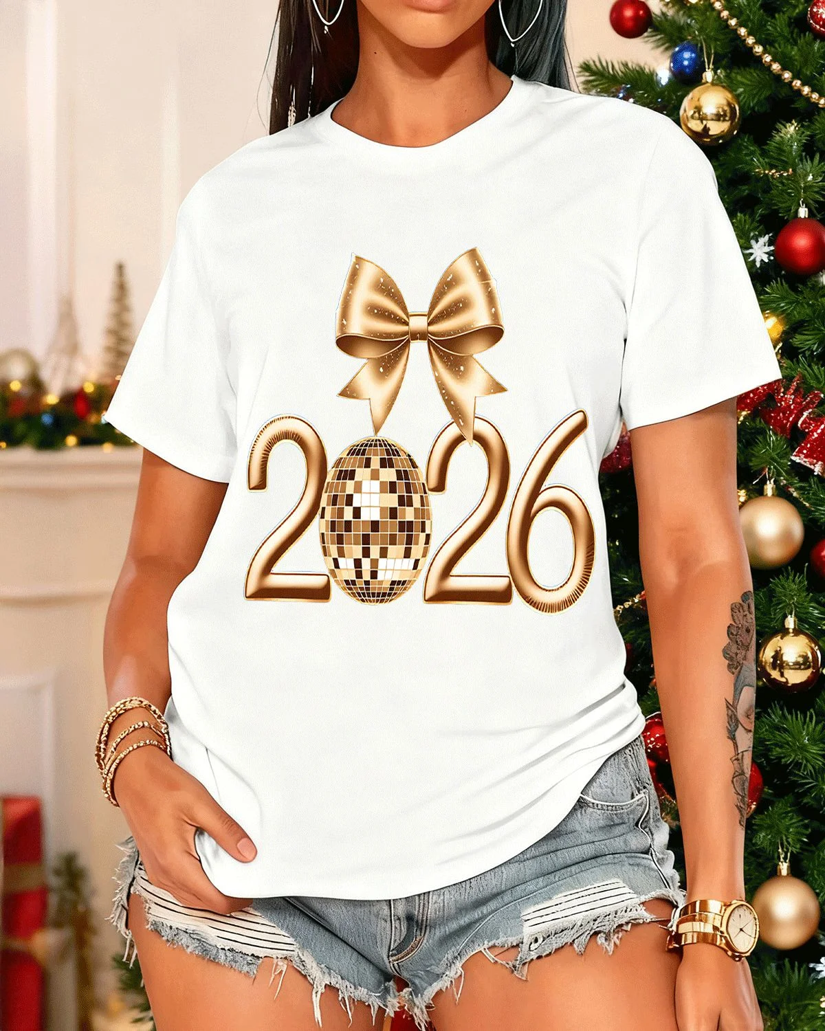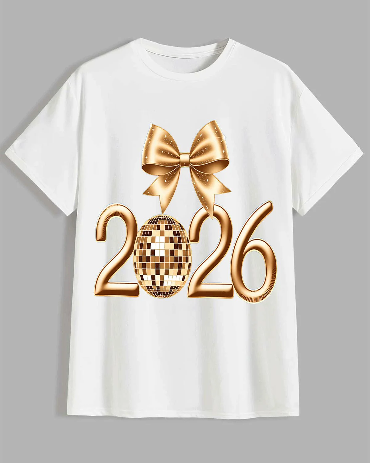2026 New Year Gold Disco Ball and Bow Summer Cotton Graphic T Shirt - Trendy Vintage, Short Sleeve, Soft Fabric, Comfortable Fit