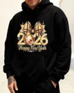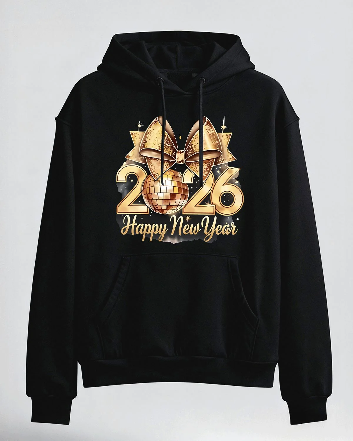 2026 New Year Golden Bow and Disco Ball Cozy Graphic Hoodie for Men and Women - Classic Vintage, Long Sleeve, Soft Fabric, Comfortable Fit