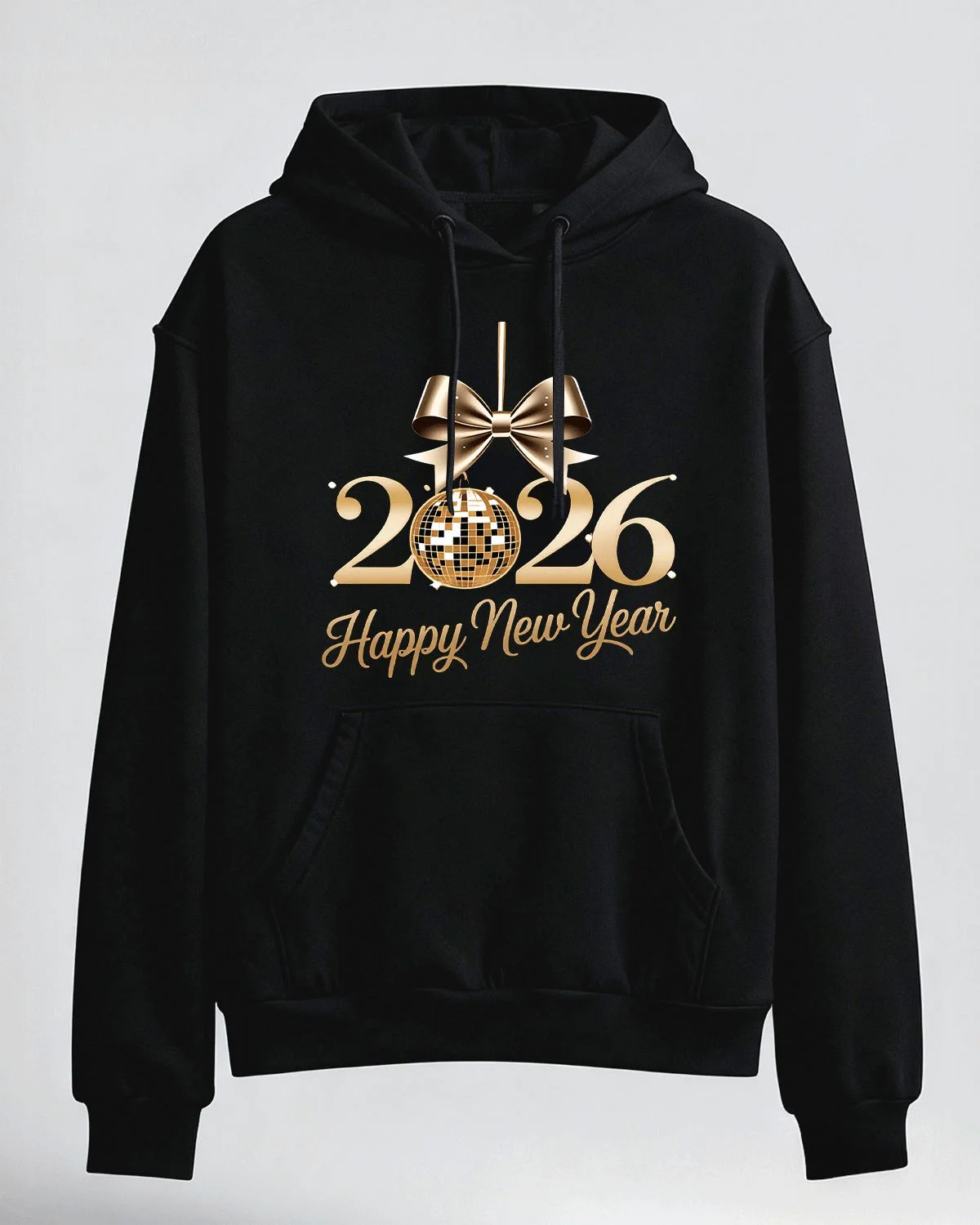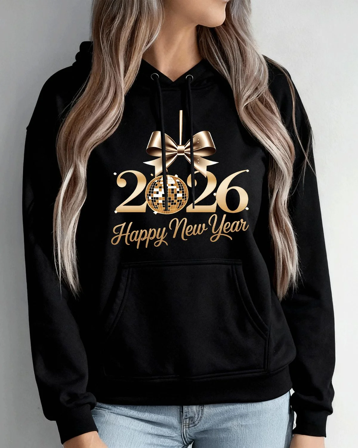 2026 New Year Golden Disco Ball and Bow Cozy Graphic Hoodie for Men and Women - Trendy Classic, Long Sleeve, Soft Fabric, Comfortable Fit