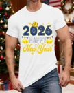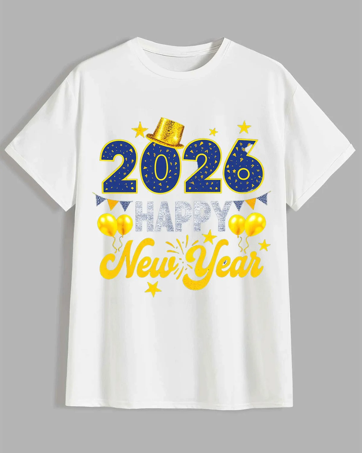 2026 New Year Happy Celebration with Balloons Summer Cotton Graphic T Shirt - Casual Vintage, Short Sleeve, Soft Fabric, Comfortable Fit