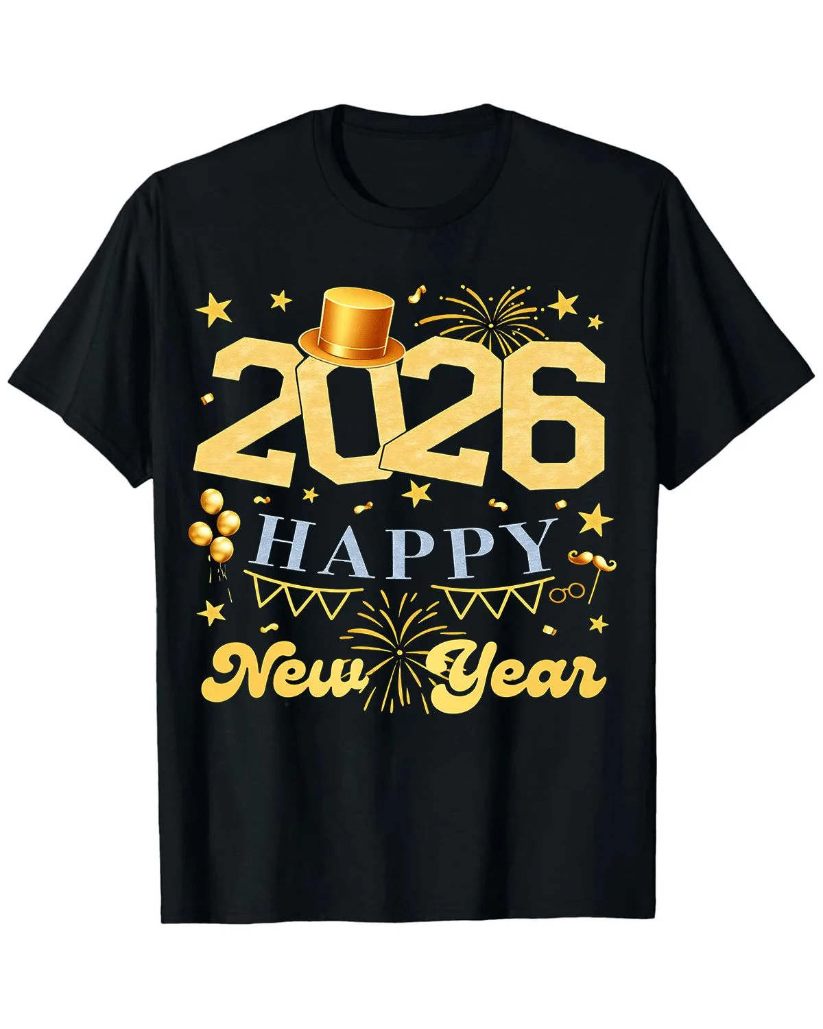 2026 New Year Happy Celebration with Fireworks Summer Cotton Graphic T Shirt - Casual Vintage, Short Sleeve, Soft Fabric, Comfortable Fit