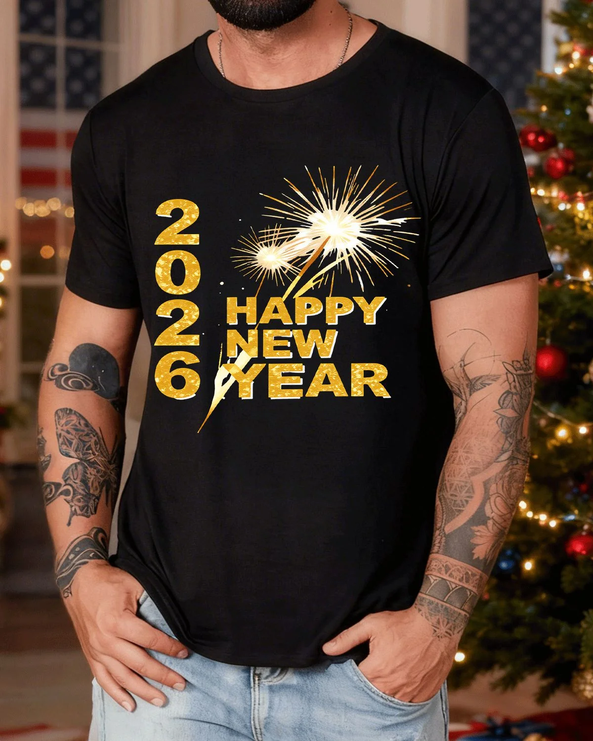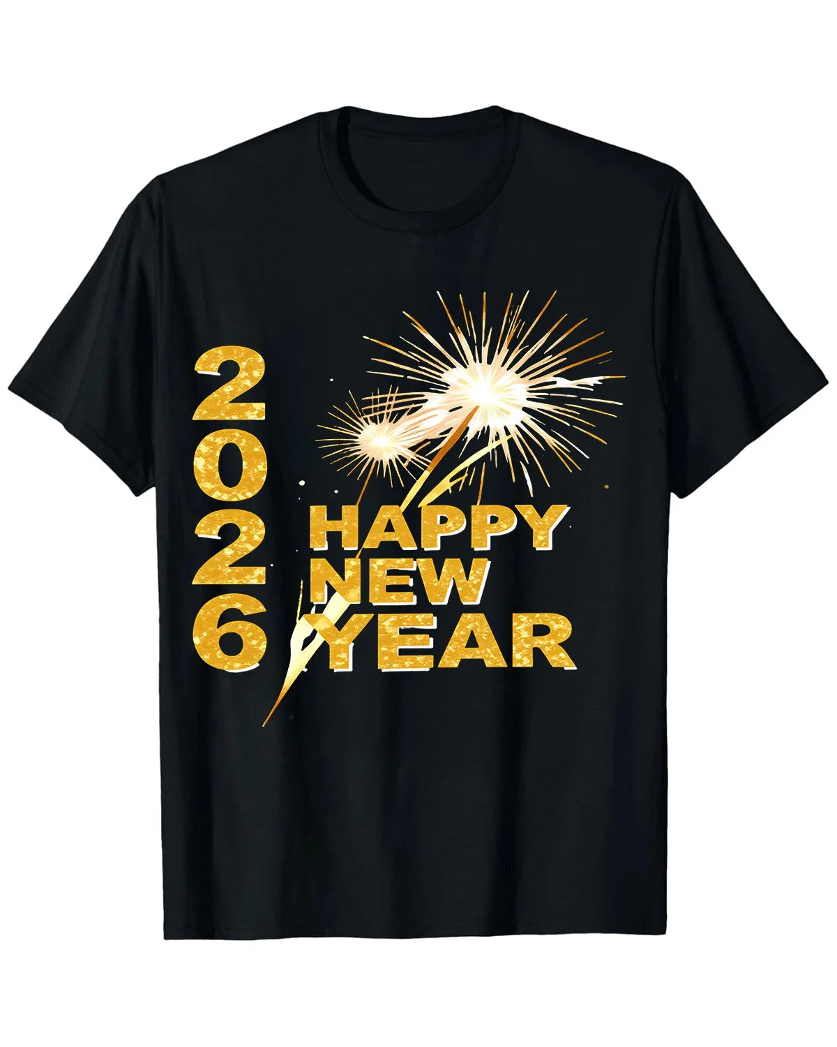 2026 New Year Happy Celebration with Fireworks Summer Cotton Graphic T Shirt - Casual Vintage, Short Sleeve, Soft Fabric, Comfortable Fit