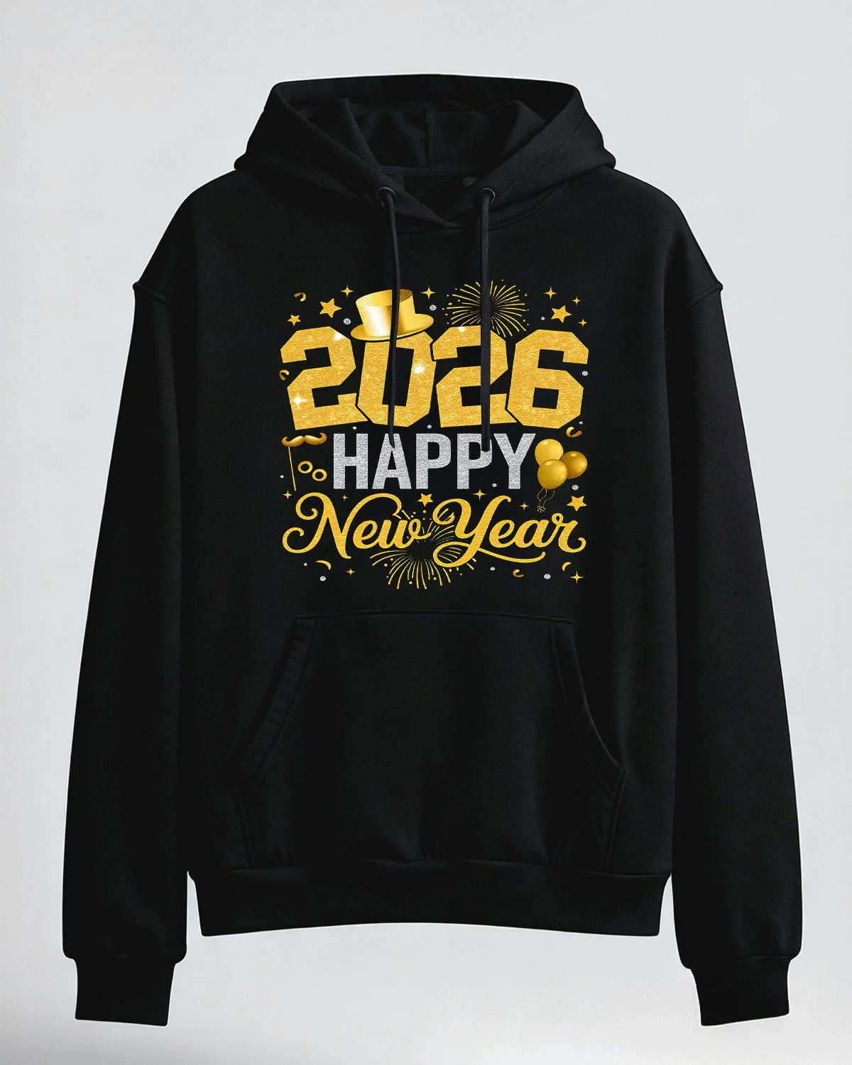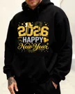 2026 New Year Happy Gold Glitter Fireworks Cozy Graphic Hoodie for Men and Women - Casual Vintage, Long Sleeve, Soft Fabric, Comfortable Fit