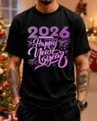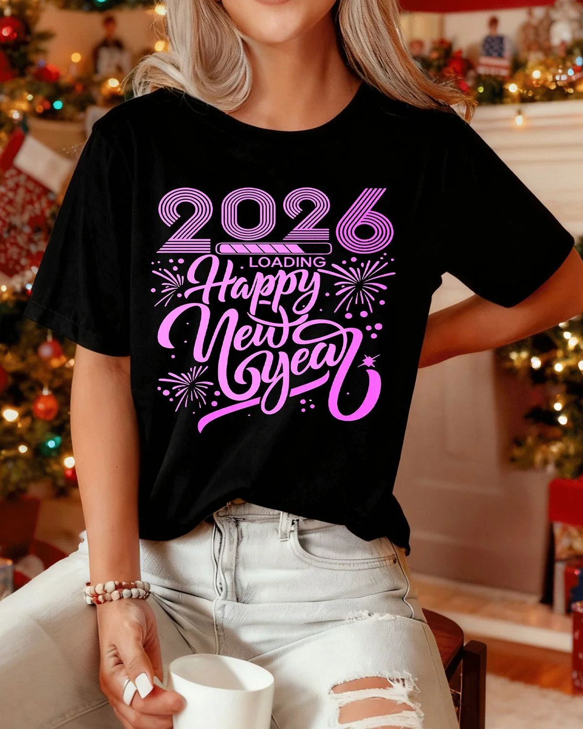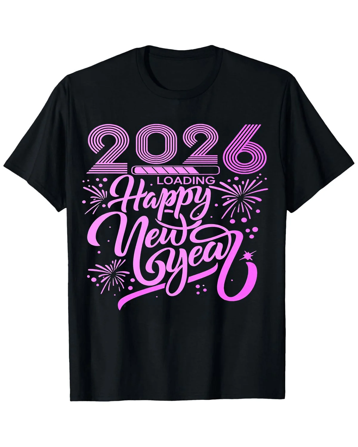 2026 New Year Loading Happy New Year Fireworks Summer Cotton Graphic T Shirt - Casual Vintage, Short Sleeve, Soft Fabric, Comfortable Fit