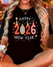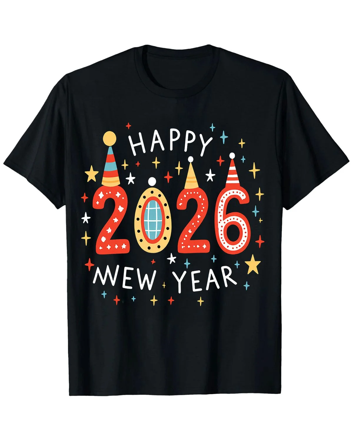 2026 New Year Party Hats and Stars Summer Cotton Graphic T Shirt - Casual Vintage, Short Sleeve, Soft Fabric, Comfortable Fit