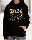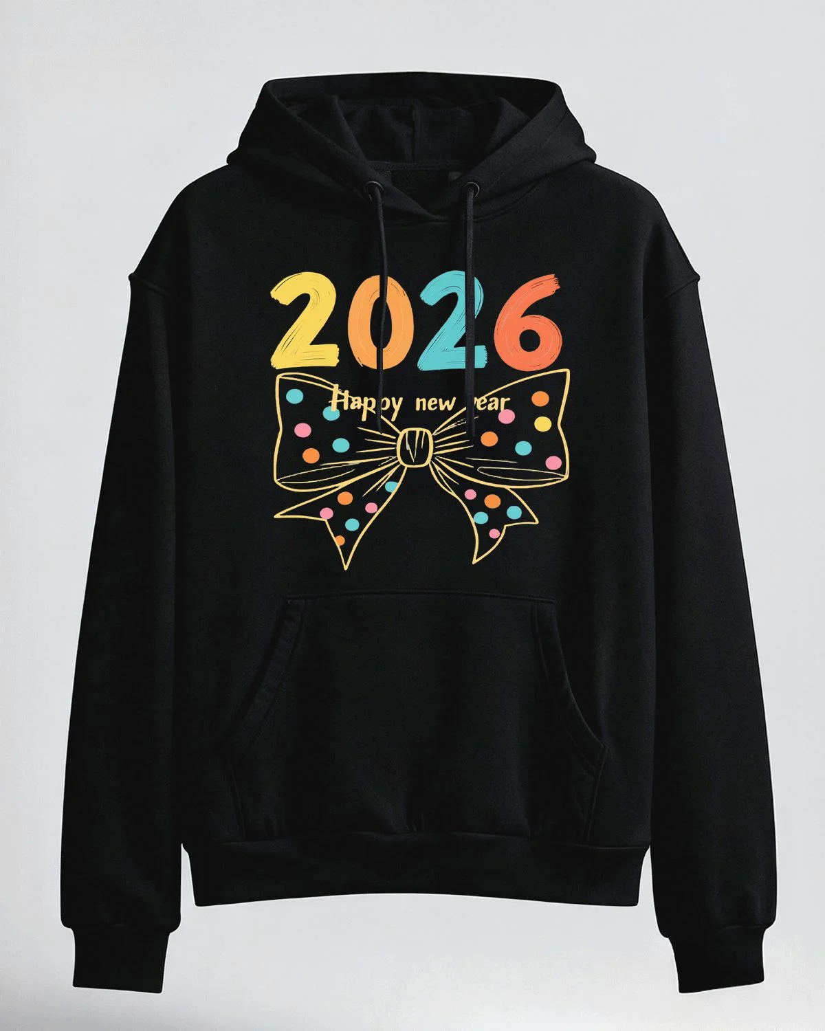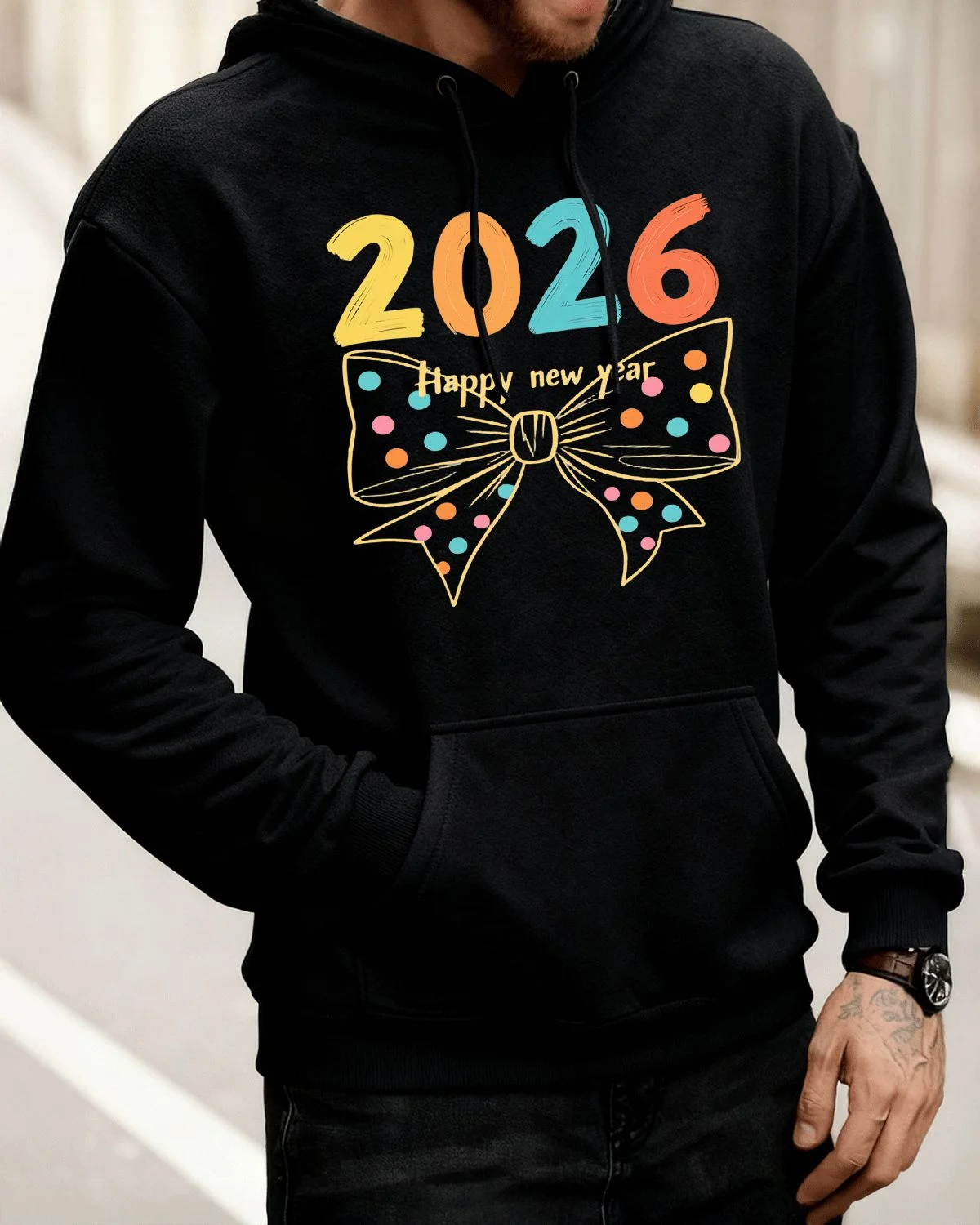 2026 New Year Polka Dot Bow Happy Message Cozy Graphic Hoodie for Men and Women - Casual Vintage, Long Sleeve, Soft Fabric, Comfortable Fit