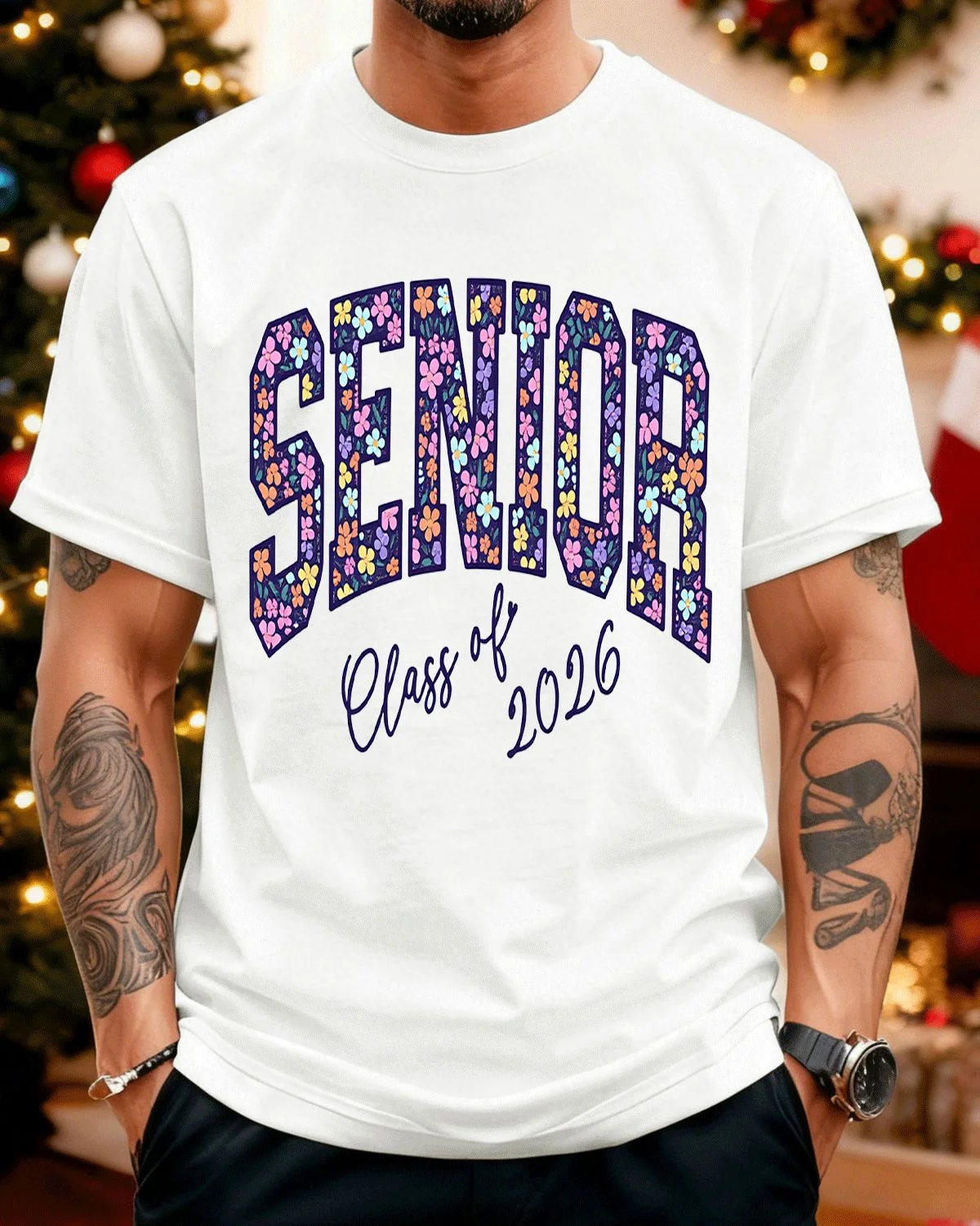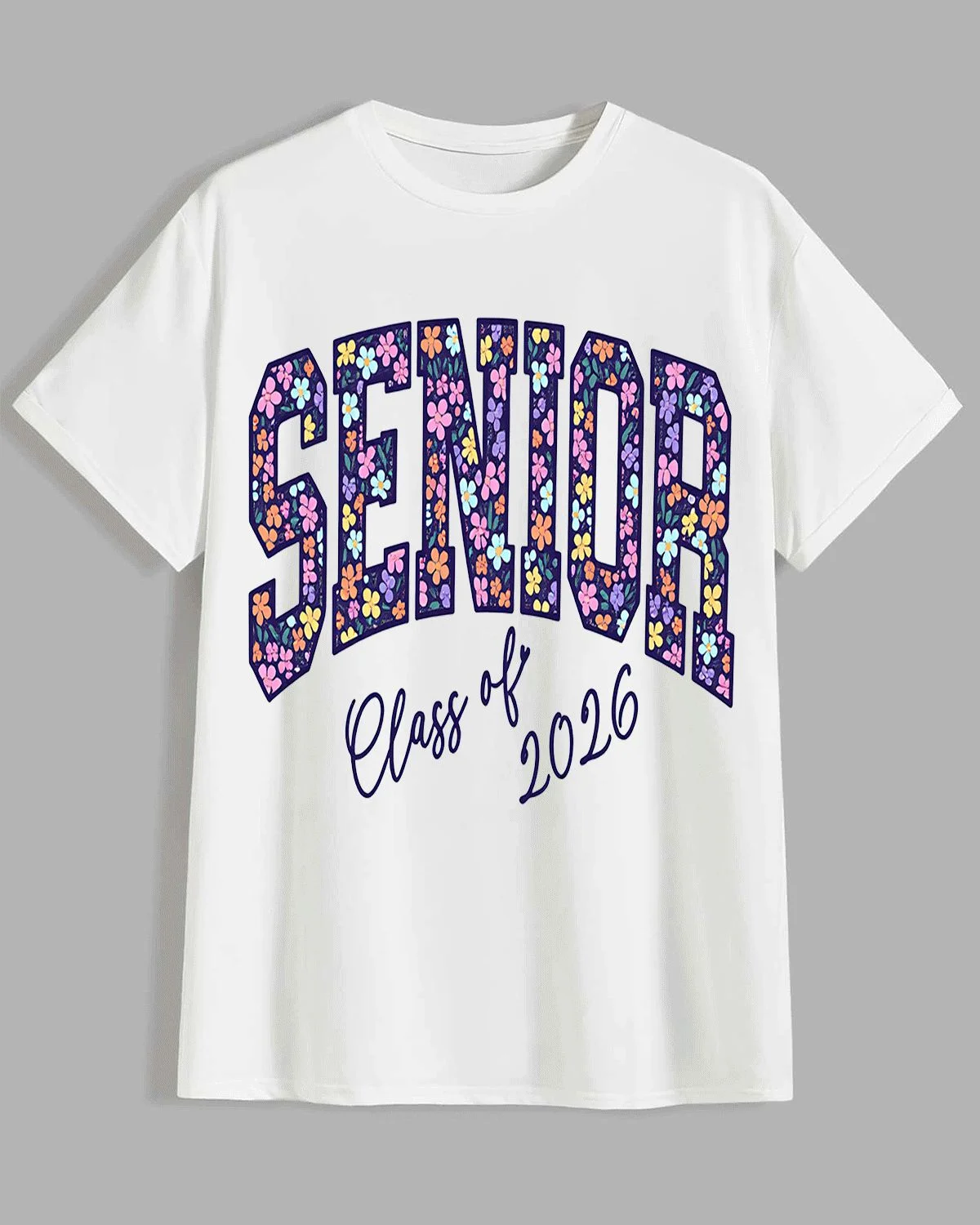 2026 New Year Senior Class Floral Print Summer Cotton Graphic T Shirt - Casual Vintage, Short Sleeve, Soft Fabric, Comfortable Fit