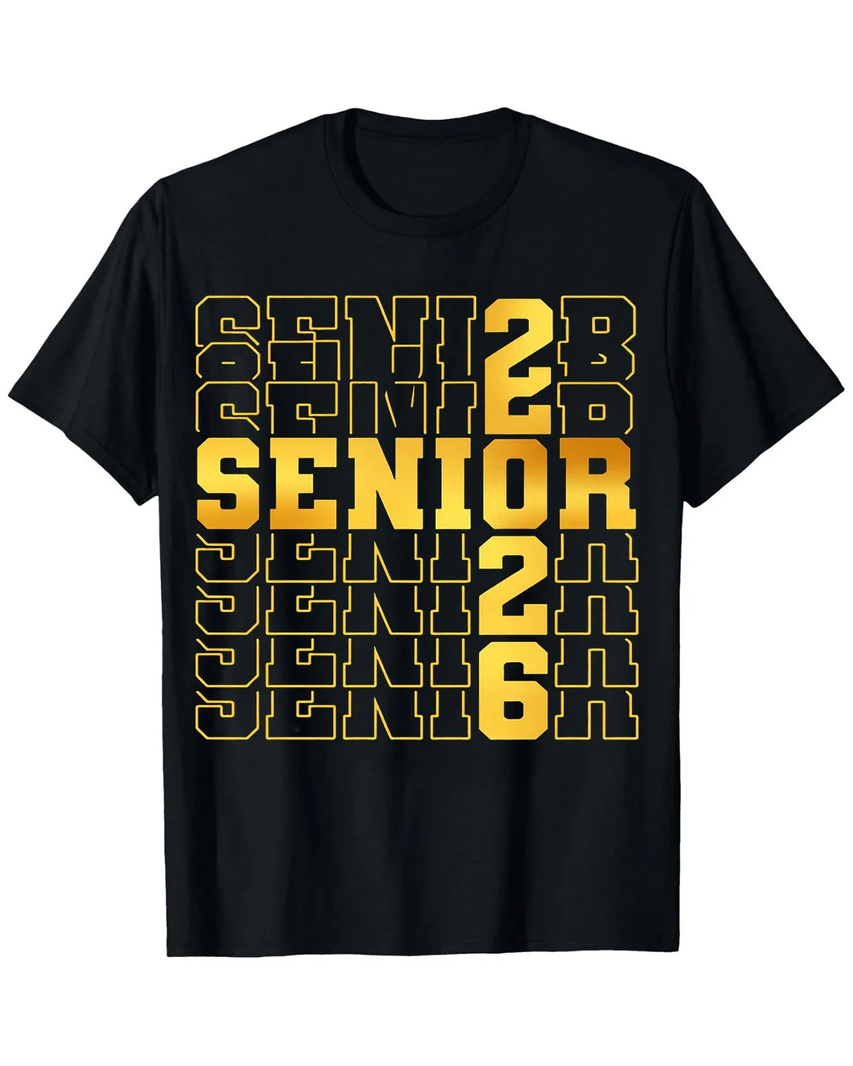 2026 New Year Senior Gold Block Text Summer Cotton Graphic T Shirt - Casual Vintage, Short Sleeve, Soft Fabric, Comfortable Fit