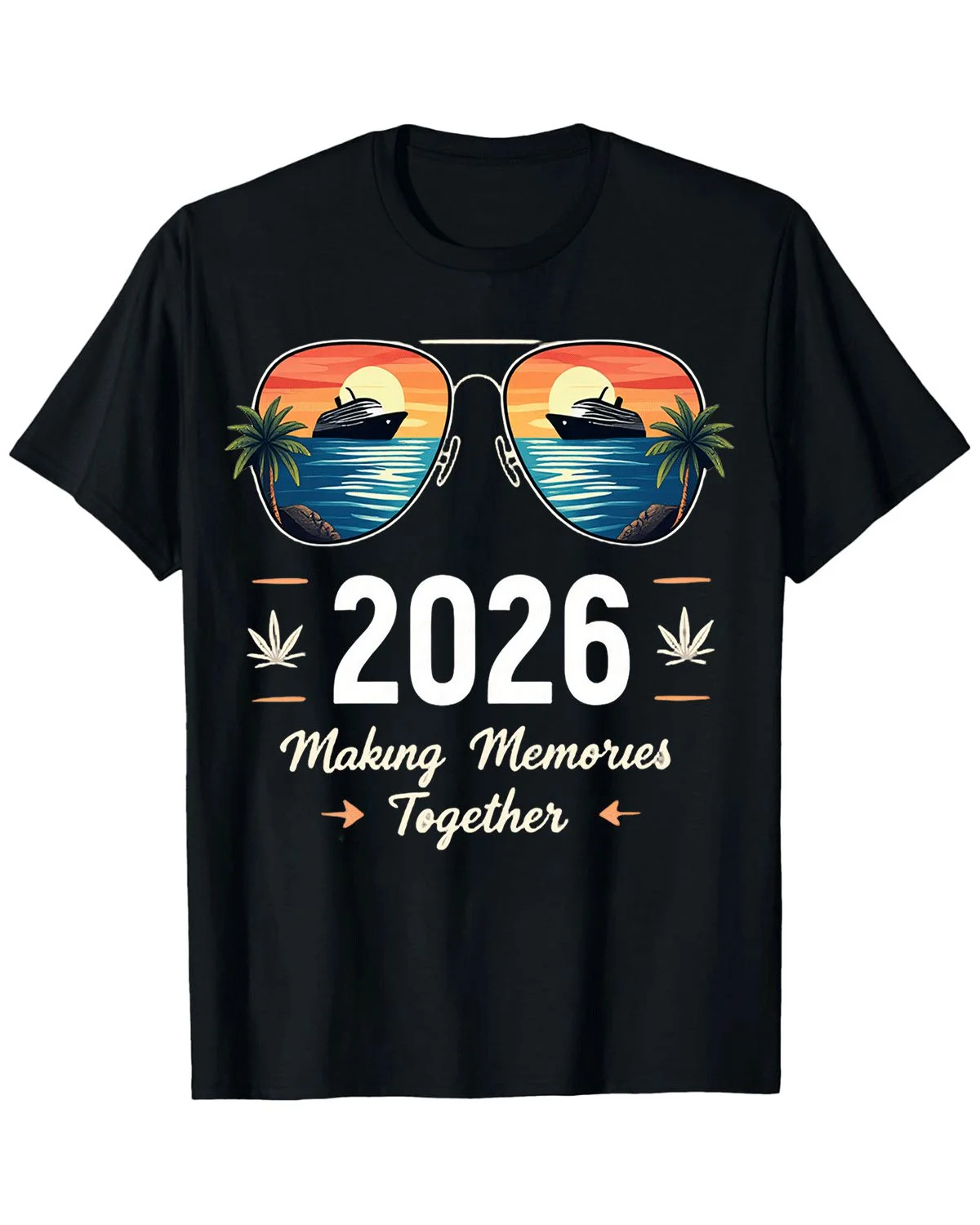 2026 New Year Sunset Cruise Making Memories Summer Cotton Graphic T Shirt - Casual Vintage, Short Sleeve, Soft Fabric, Comfortable Fit