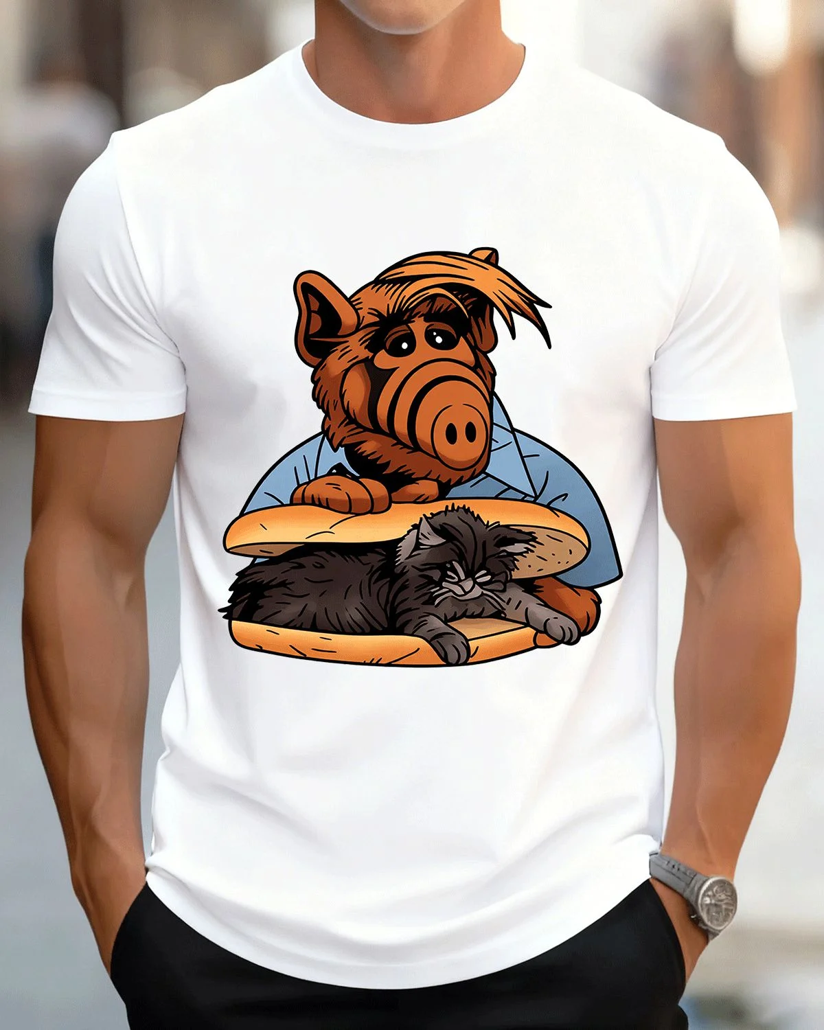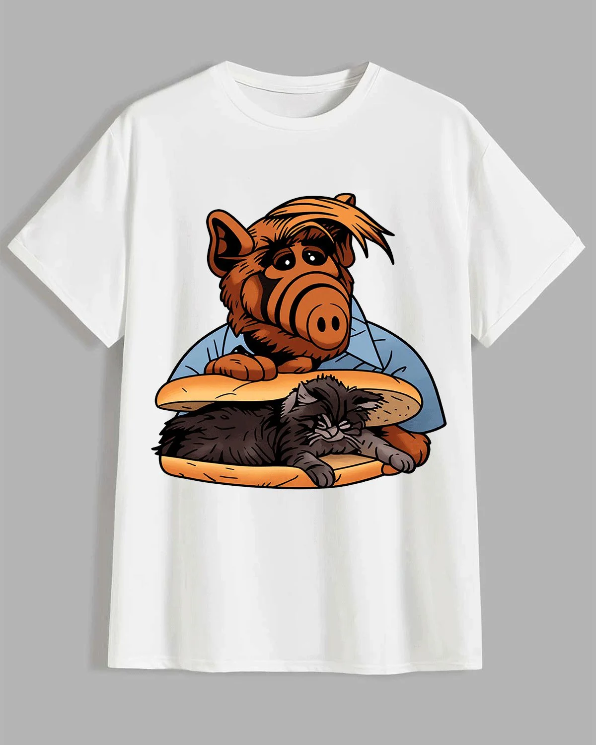 ALF Holding Cat Sandwich Summer Cotton Graphic T Shirt - Casual Vintage, Short Sleeve, Soft Fabric, Comfortable Fit