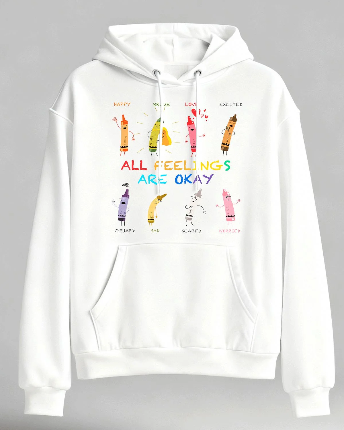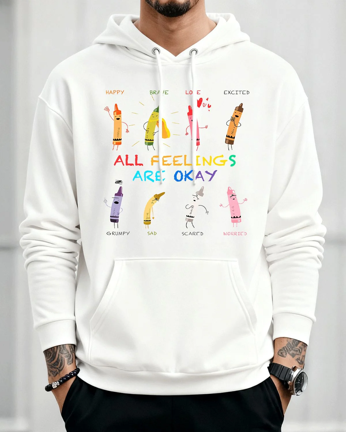 All Feelings Are Okay Colorful Crayon Cozy Graphic Hoodie for Men and Women - Casual Artistic, Long Sleeve, Soft Fabric, Comfortable Fit