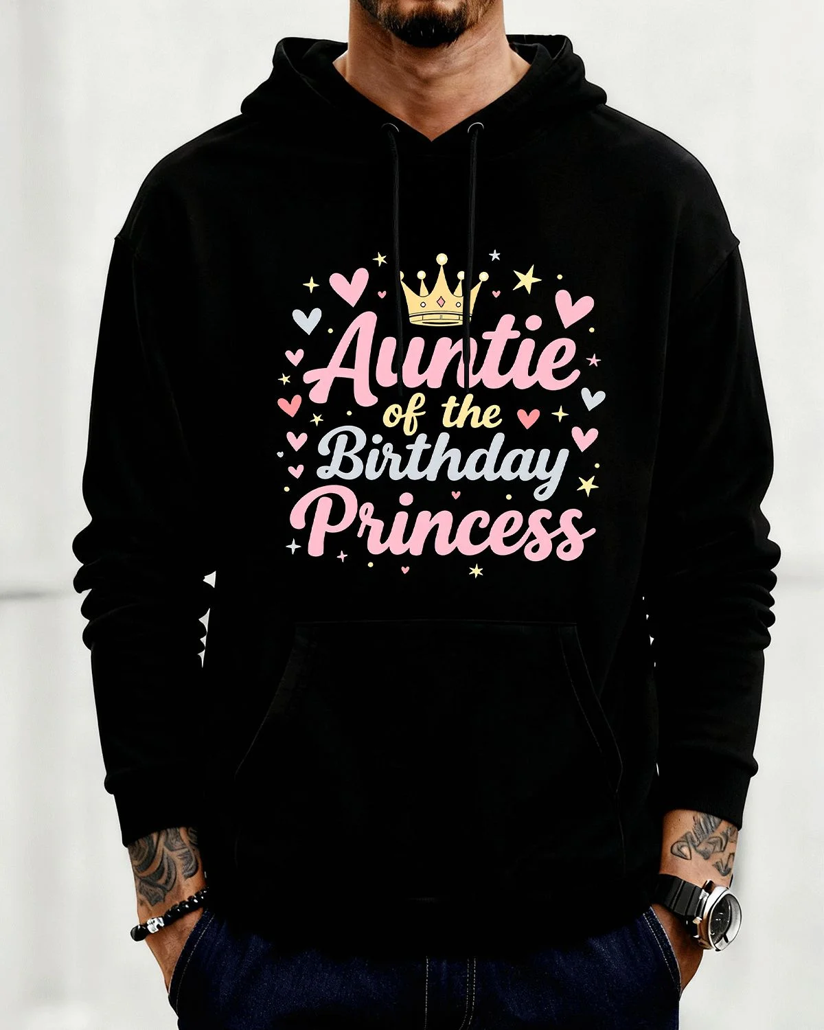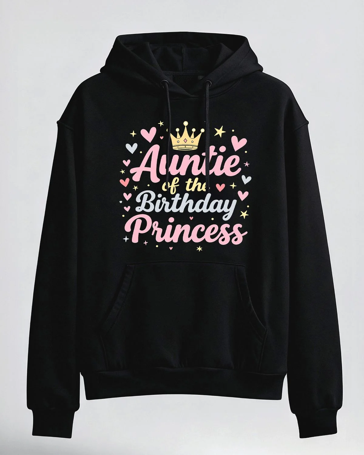 Auntie of the Birthday Princess with Hearts and Crown Cozy Graphic Hoodie for Men and Women - Casual Chic, Long Sleeve, Soft Fabric, Comfortable Fit