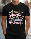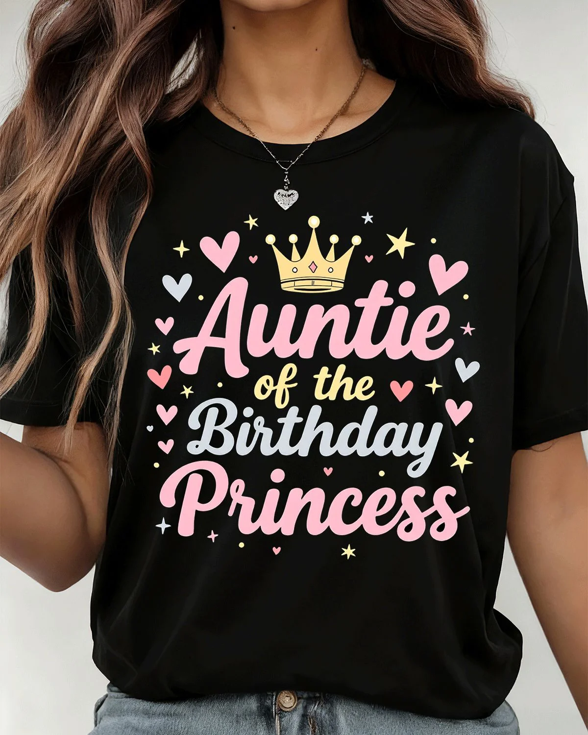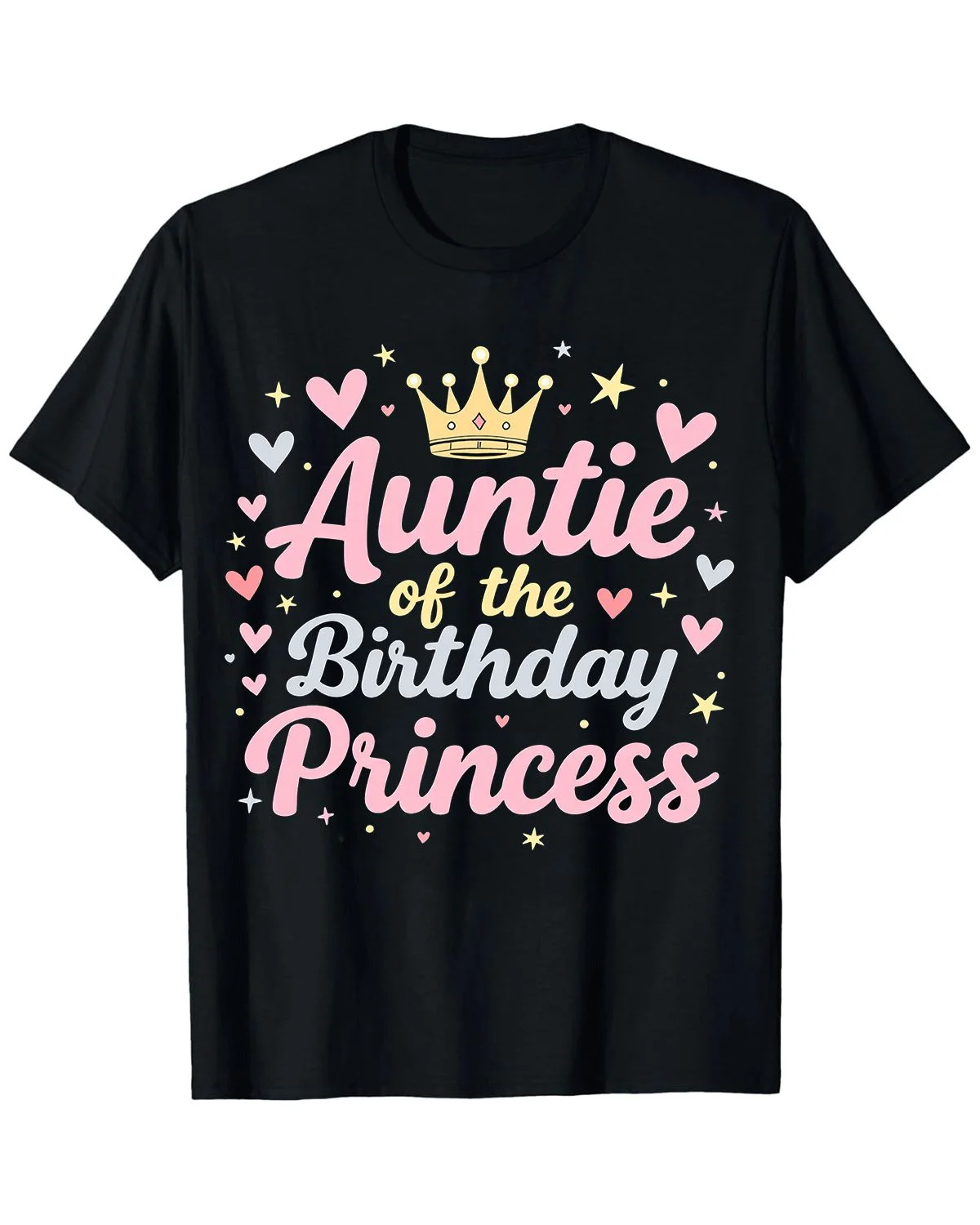 Auntie of the Birthday Princess with Hearts and Crown Summer Cotton Graphic T Shirt - Casual Chic, Short Sleeve, Soft Fabric, Comfortable Fit