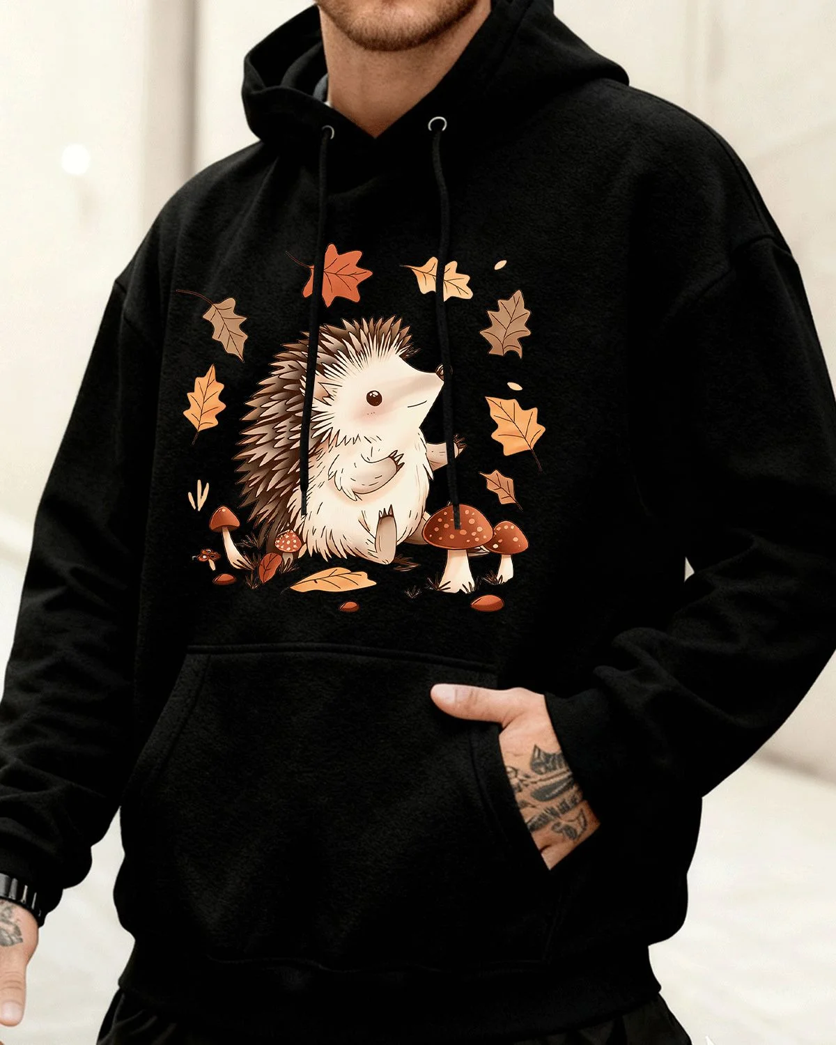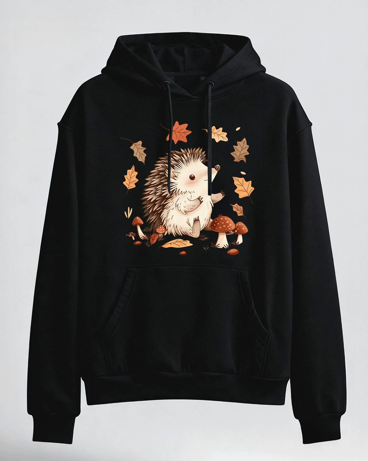 Autumn Hedgehog with Falling Leaves Cozy Graphic Hoodie for Men and Women - Casual Artistic, Long Sleeve, Soft Fabric, Comfortable Fit