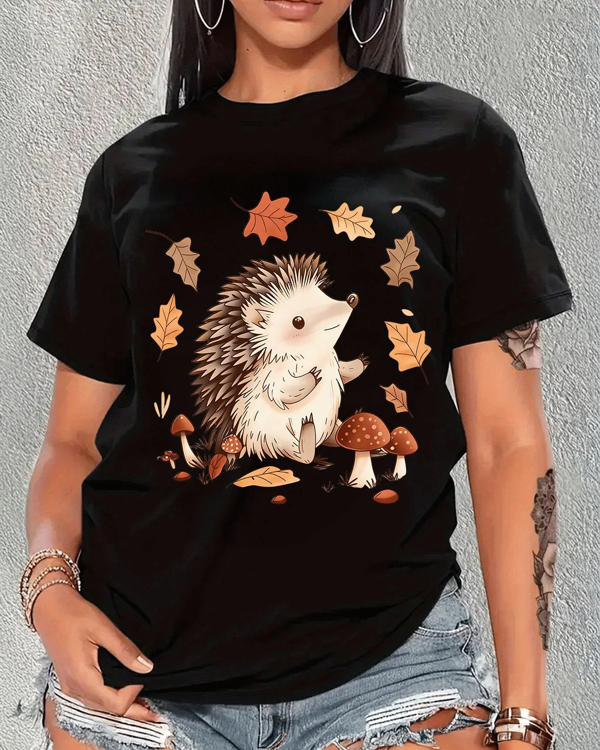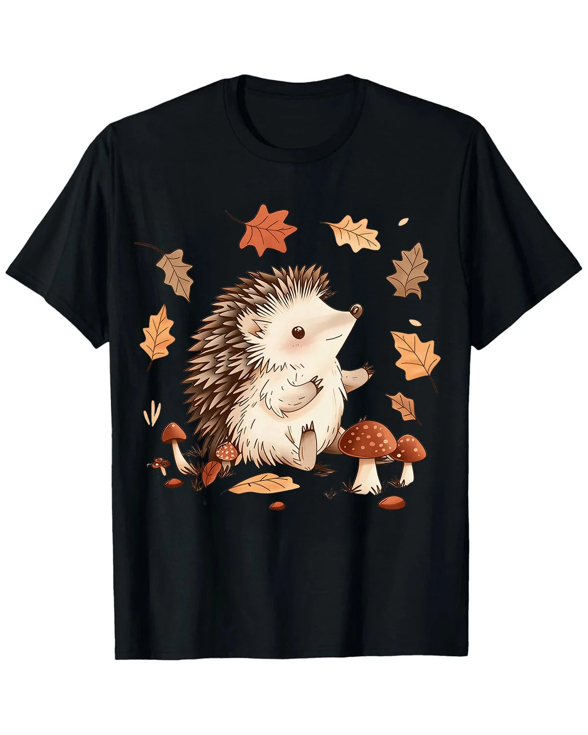 Autumn Hedgehog with Falling Leaves Summer Cotton Graphic T Shirt - Casual Artistic, Short Sleeve, Soft Fabric, Comfortable Fit
