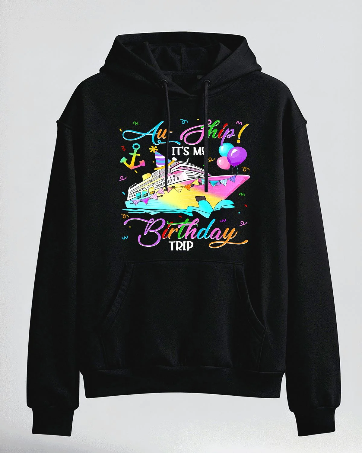 Aw Ship It's My Birthday Cruise Cozy Graphic Hoodie for Men and Women - Funny Casual, Long Sleeve, Soft Fabric, Comfortable Fit