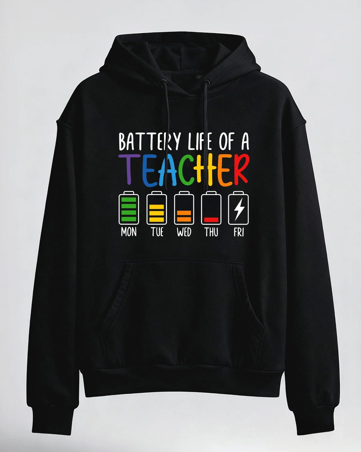 Battery Life of a Teacher Cozy Cotton Graphic Hoodie-Casual Funny,Long Sleeves,Soft Fabric,Comfortable Fit