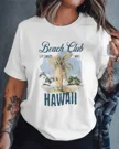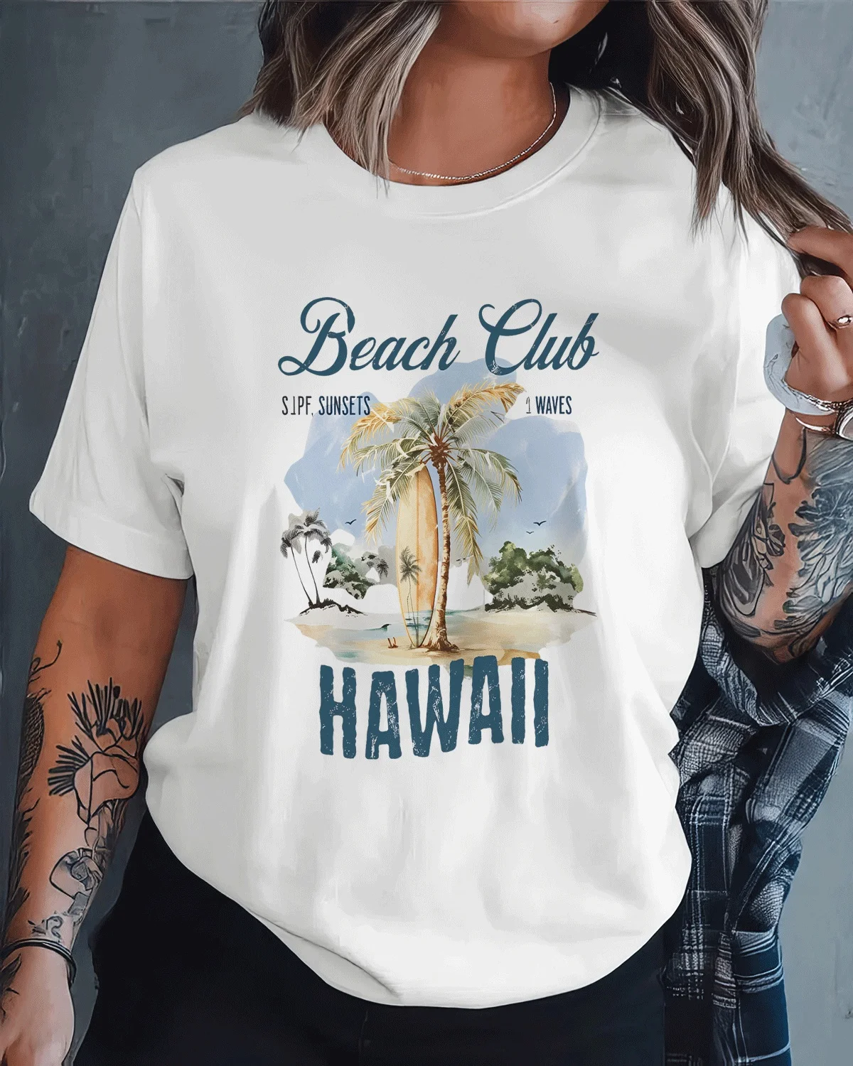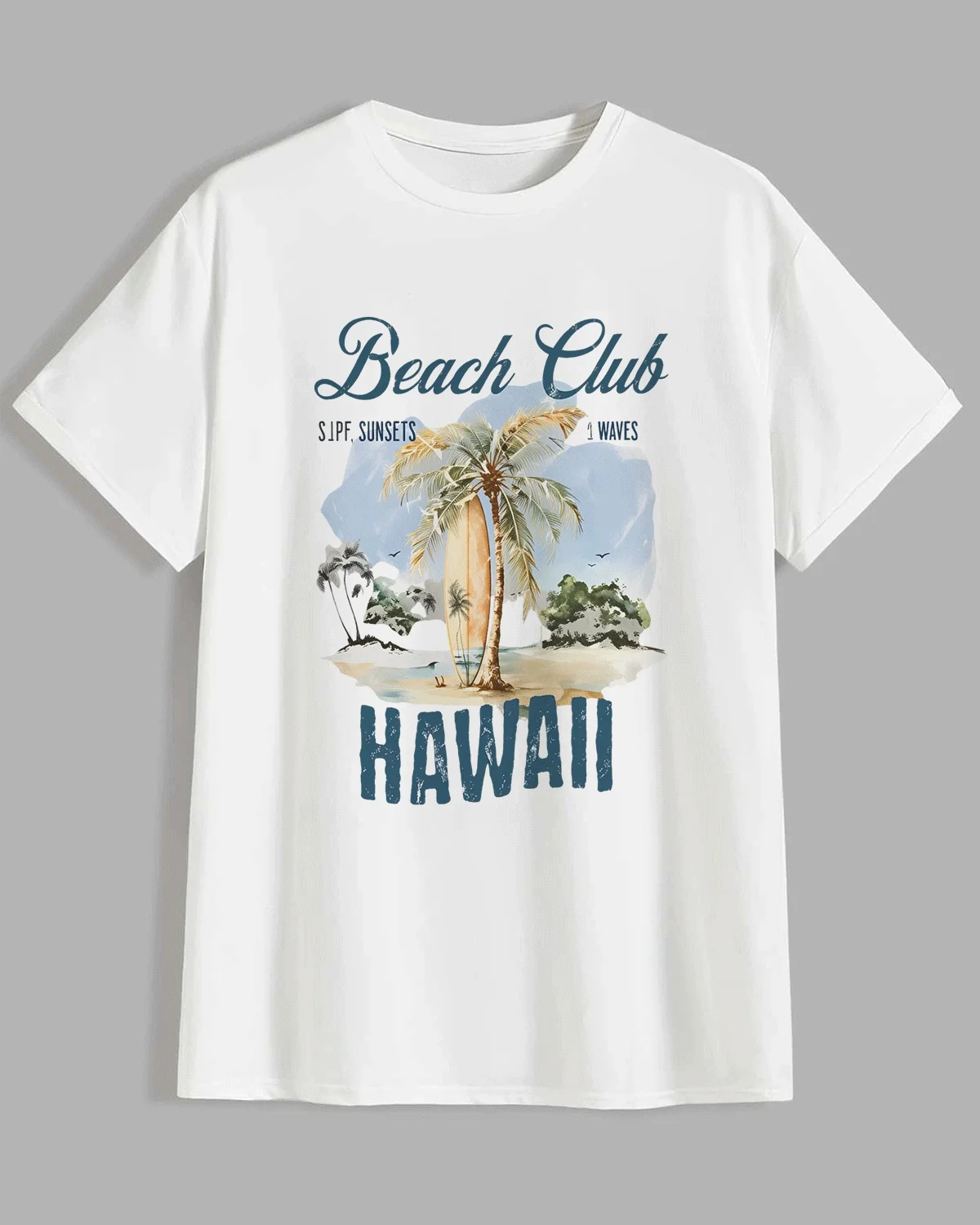 Beach Club Hawaii Surf Sunsets and Waves Summer Cotton Graphic T Shirt-Casual Vintage,Short Sleeve,Soft Fabric,Comfortable Fit