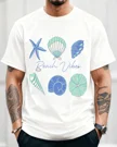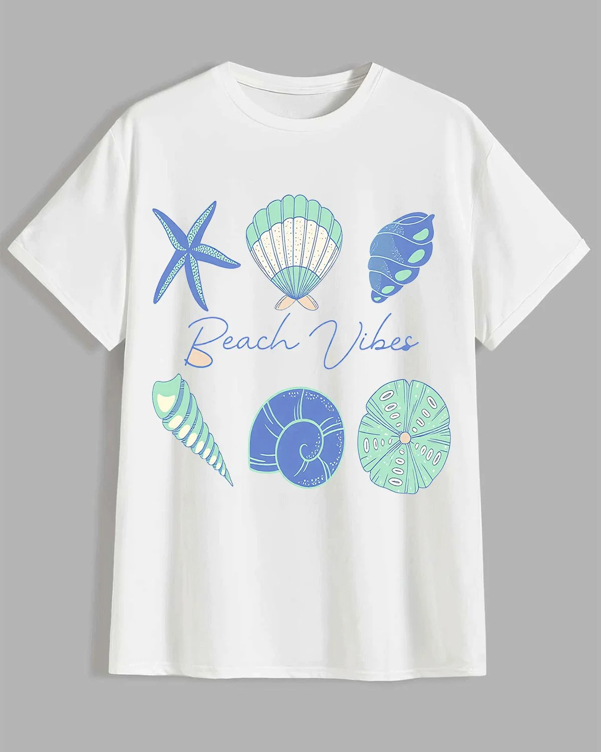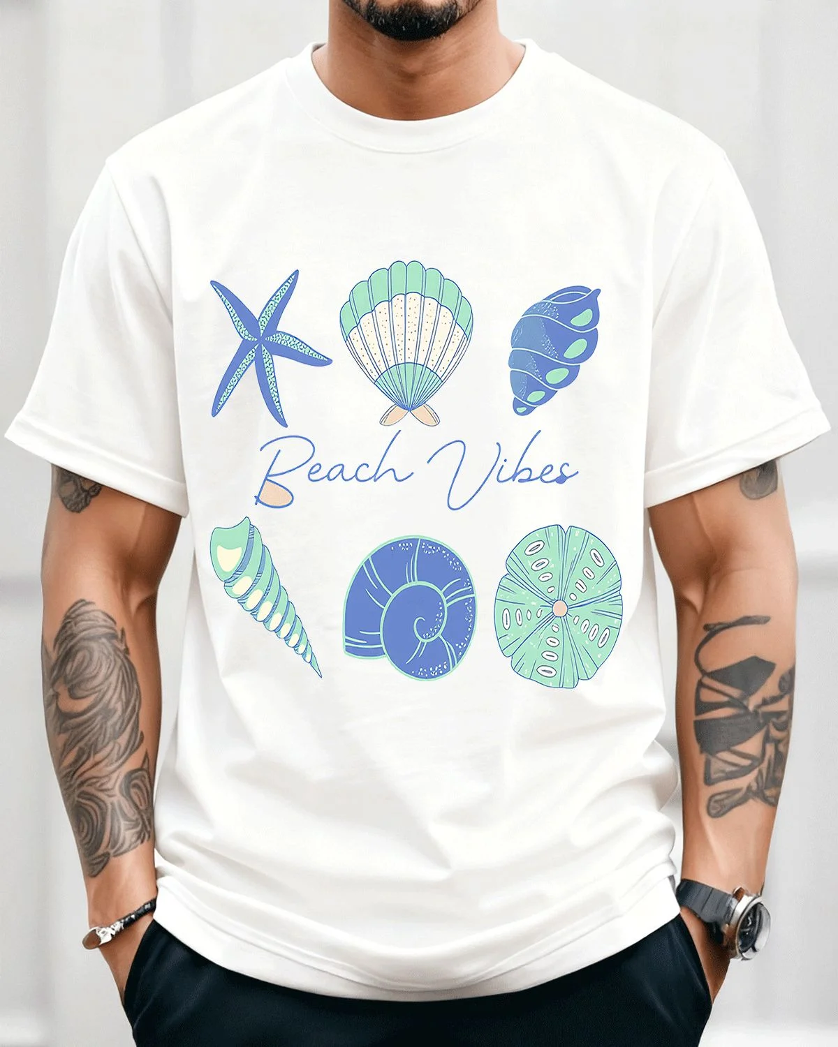 Beach Vibes Seashell Illustration Summer Cotton Graphic T Shirt - Casual Artistic,Short Sleeve,Soft Fabric,Comfortable Fit