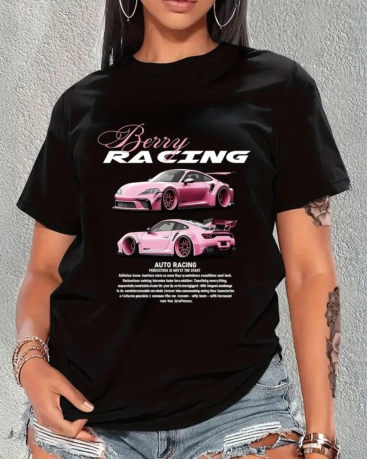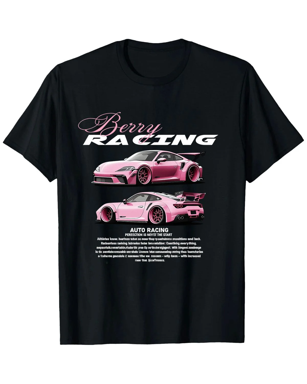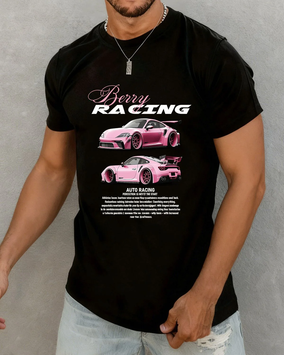 Berry Racing Pink Sports Cars Summer Cotton Graphic T Shirt - Sporty Urban,Short Sleeve,Soft Fabric,Comfortable Fit