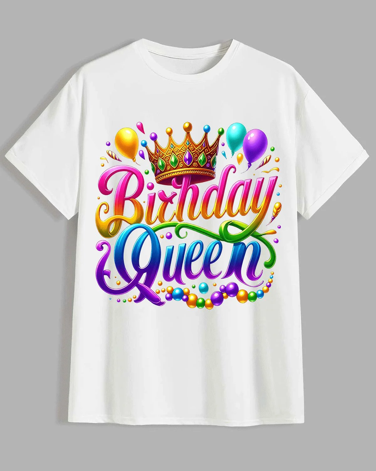 Birthday Queen Crown and Balloons Summer Cotton Graphic T Shirt - Casual Chic, Short Sleeve, Soft Fabric, Comfortable Fit