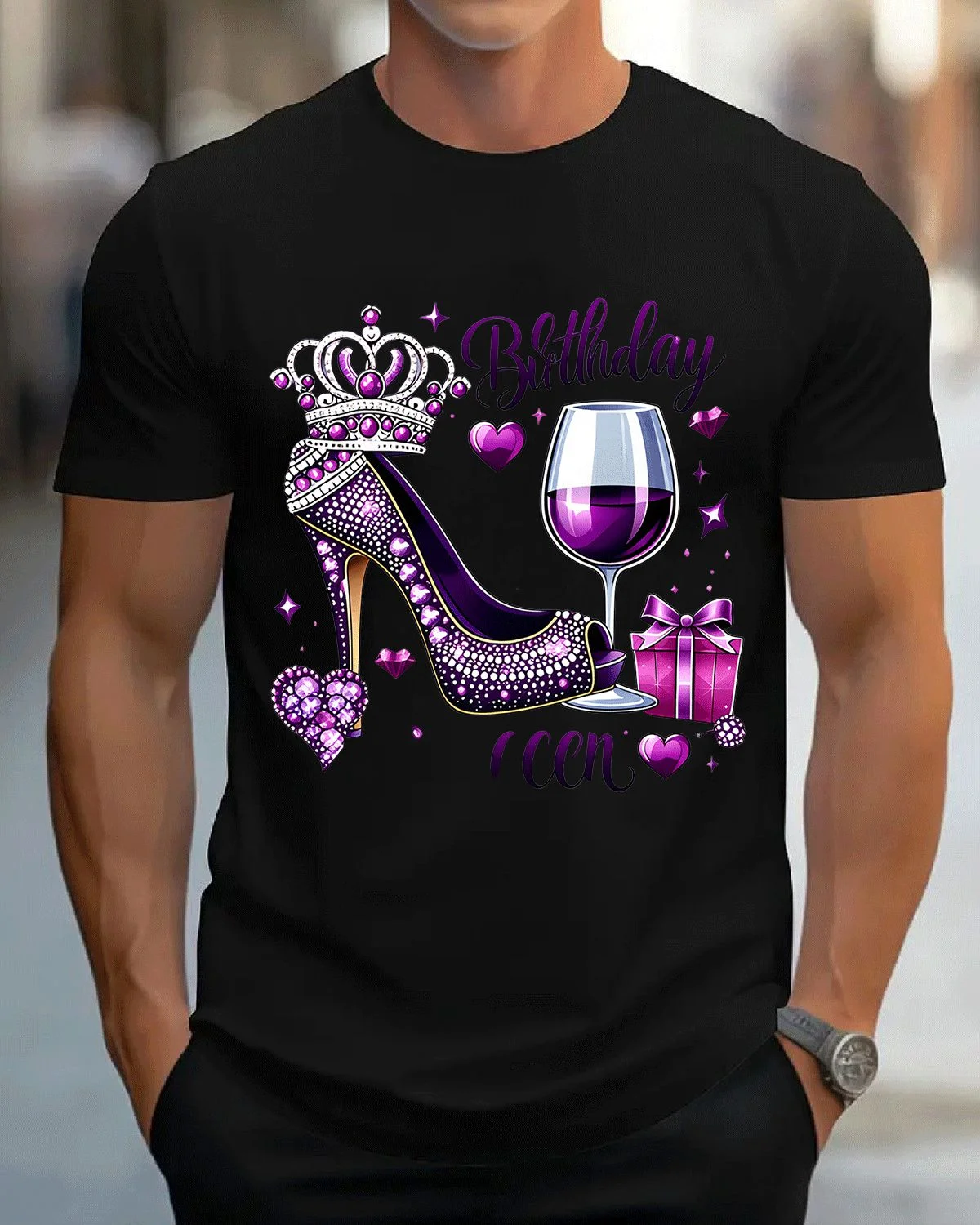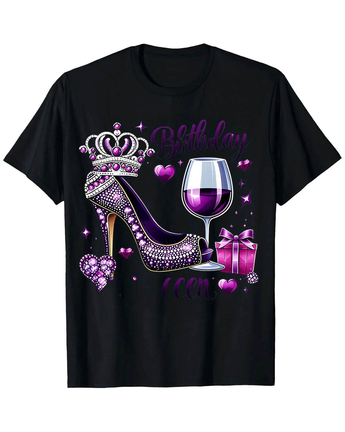 Birthday Queen Crown Heels Wine and Gift Summer Cotton Graphic T Shirt - Chic Artistic, Short Sleeve, Soft Fabric, Comfortable Fit
