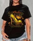 Birthday Queen Golden High Heel and Crown Summer Cotton Graphic T Shirt - Chic Glamorous, Short Sleeve, Soft Fabric, Comfortable Fit