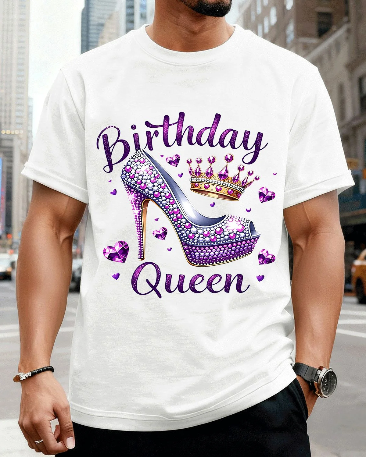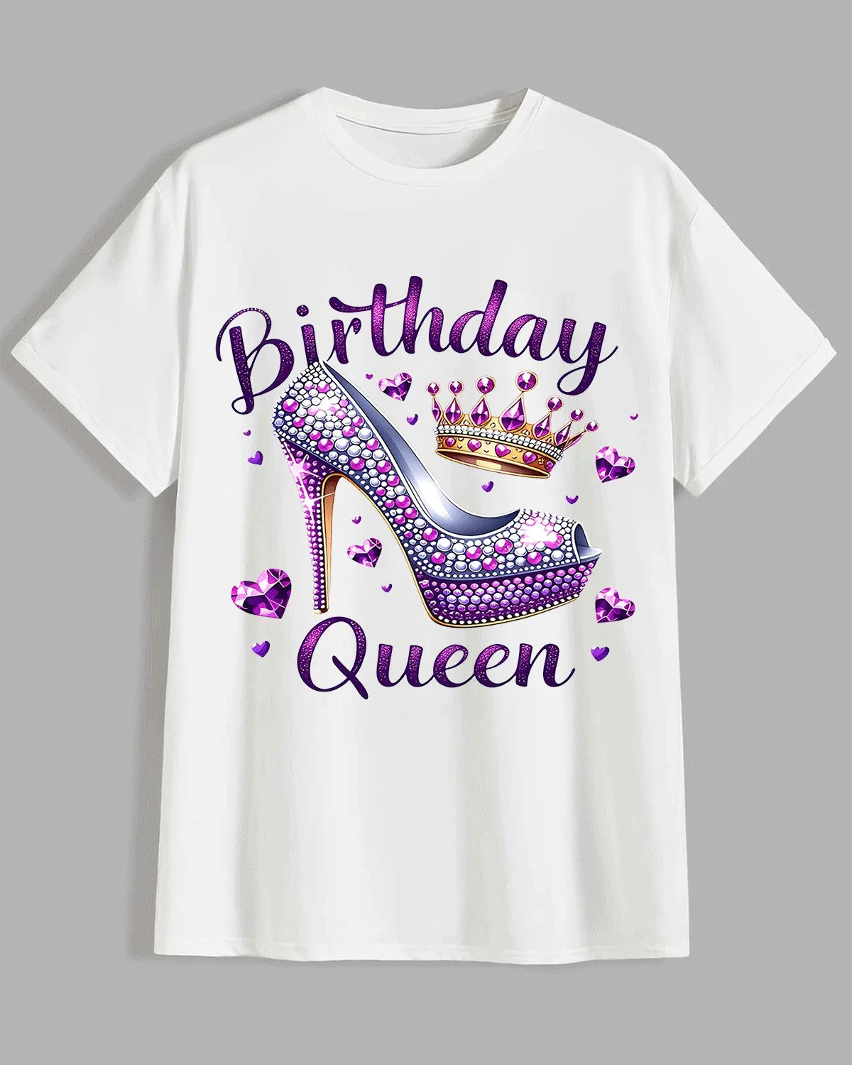 Birthday Queen High Heel and Crown Summer Cotton Graphic T Shirt - Chic Trendy, Short Sleeve, Soft Fabric, Comfortable Fit