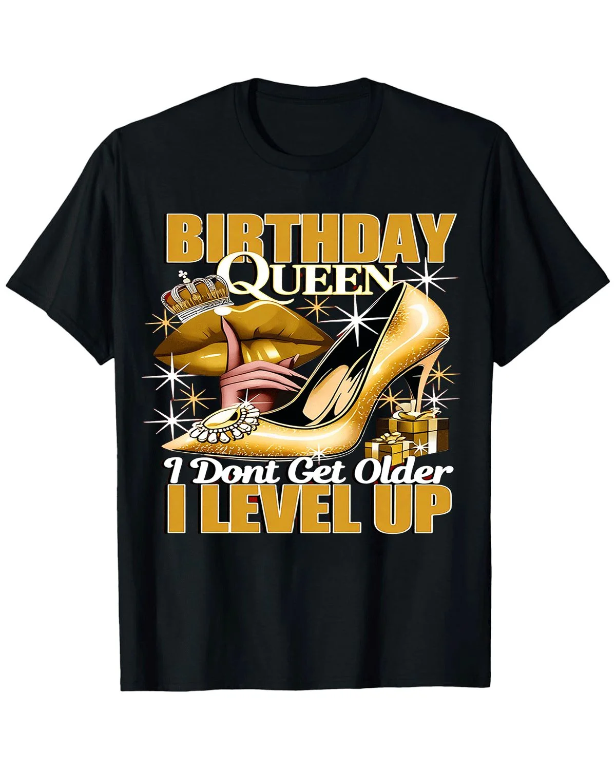 Birthday Queen Level Up Gold Heels Summer Cotton Graphic T Shirt - Trendy Chic, Short Sleeve, Soft Fabric, Comfortable Fit