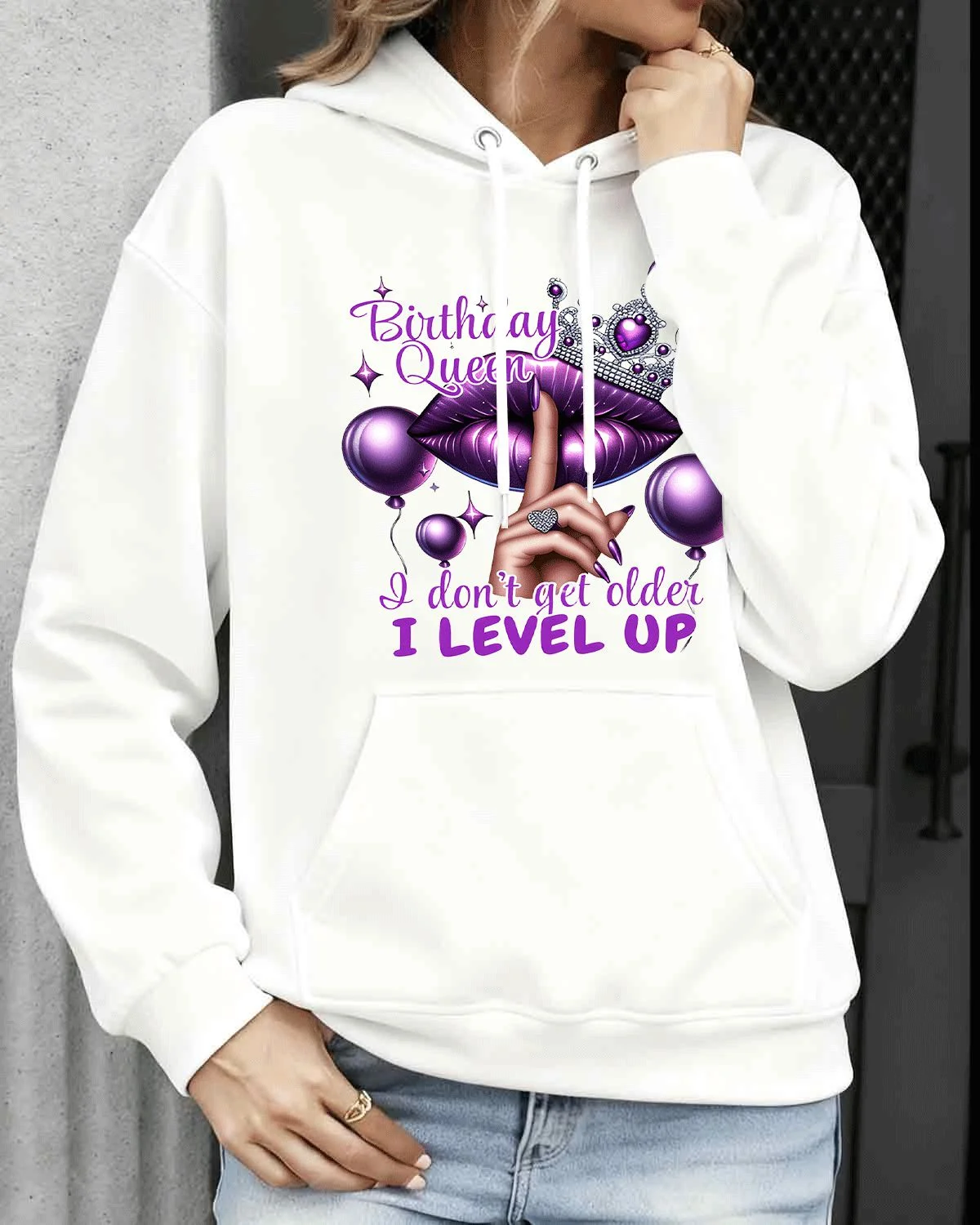 Birthday Queen Purple Lips Crown Balloons Cozy Graphic Hoodie for Men and Women - Trendy Chic, Long Sleeve, Soft Fabric, Comfortable Fit