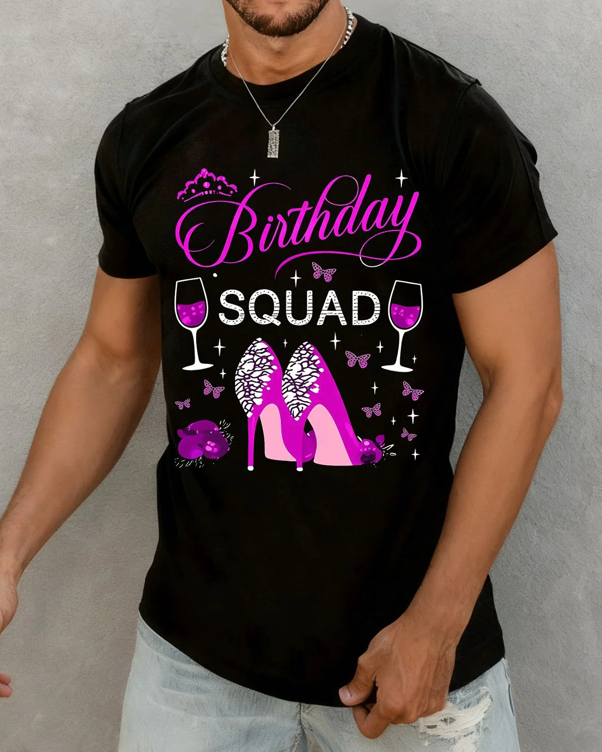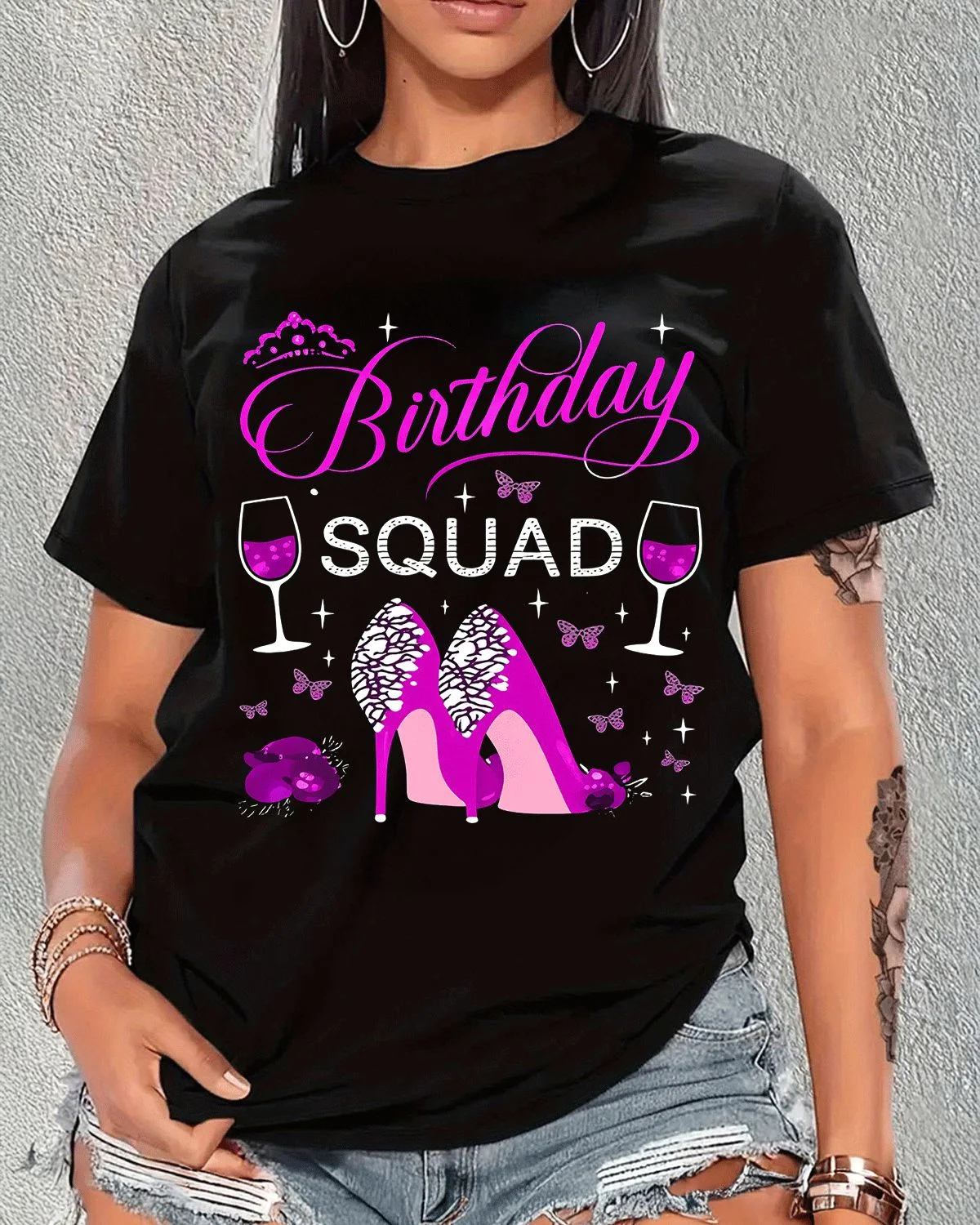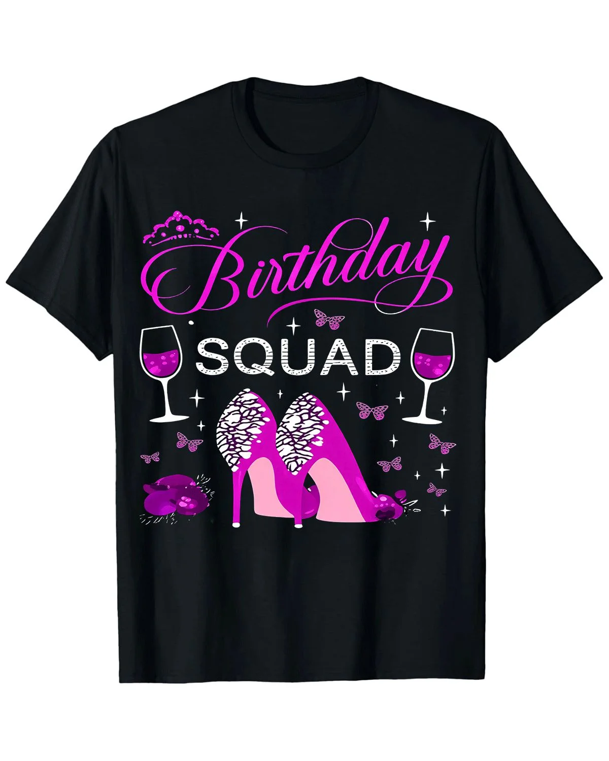 Birthday Squad Heels and Wine Summer Cotton Graphic T Shirt - Trendy Chic, Short Sleeve, Soft Fabric, Comfortable Fit