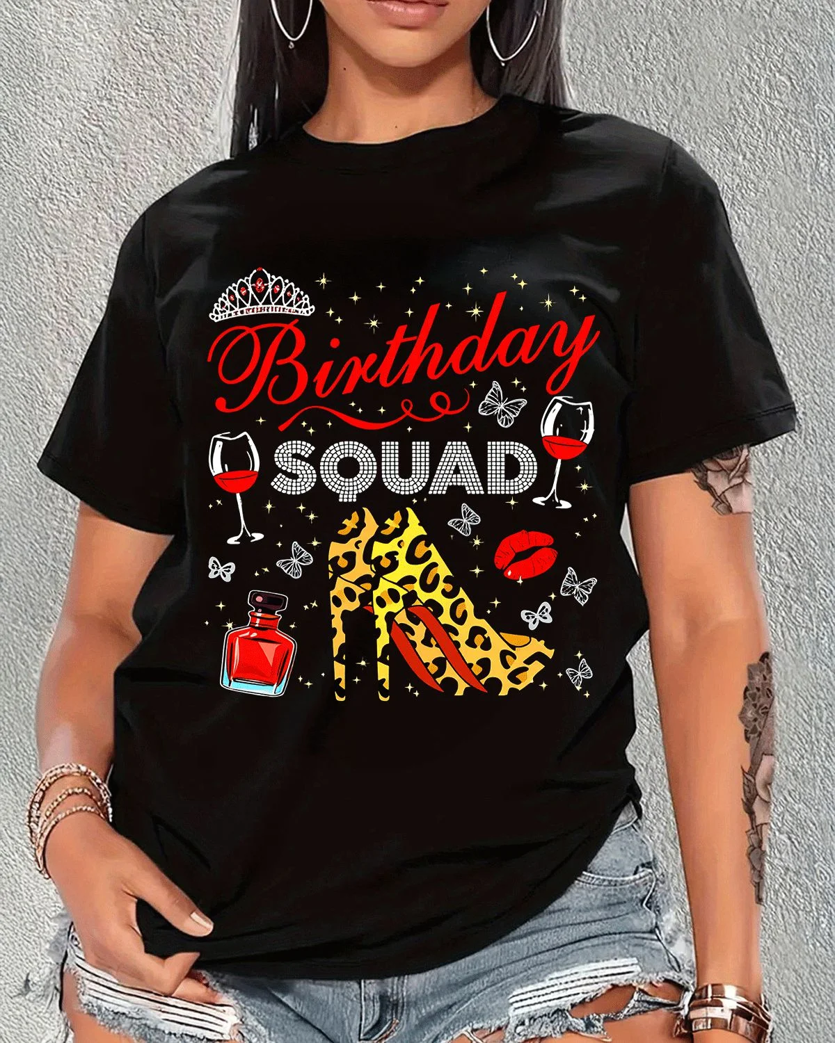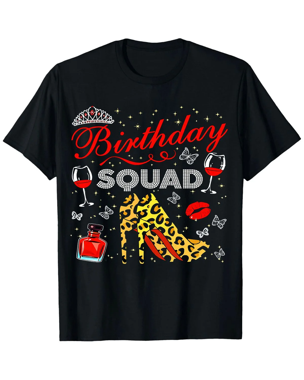 Birthday Squad Heels Wine and Butterflies Summer Cotton Graphic T Shirt - Trendy Chic, Short Sleeve, Soft Fabric, Comfortable Fit