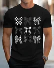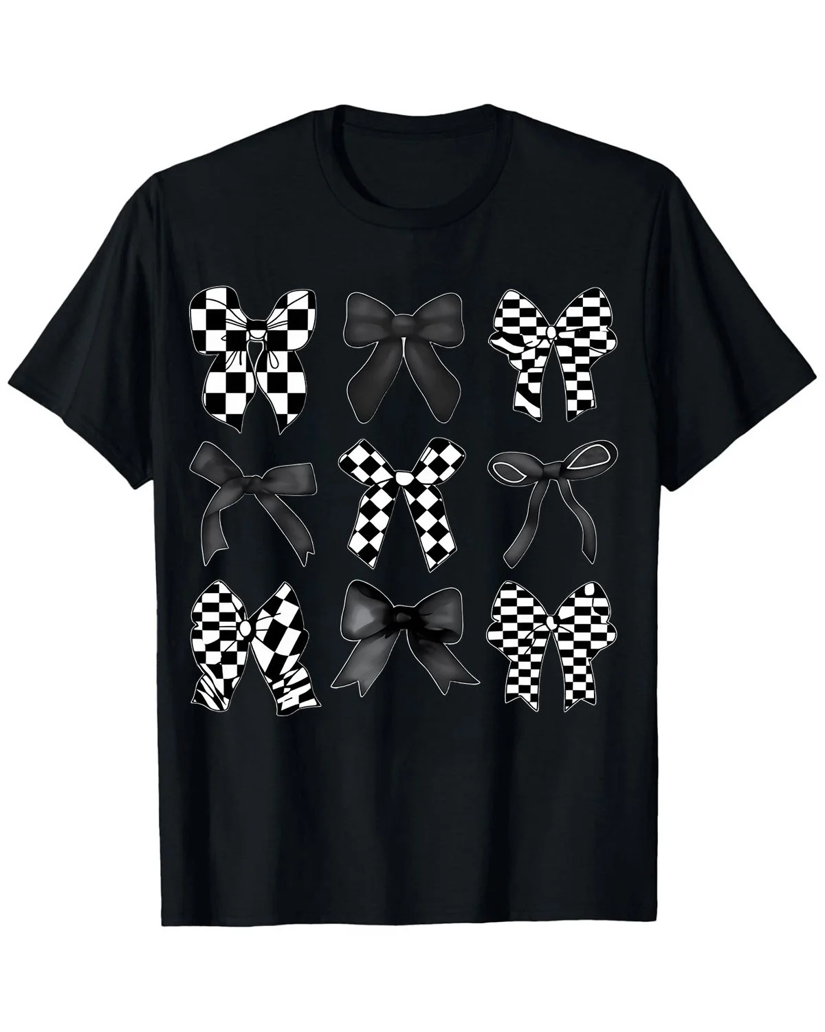 Black and White Checkered Bow Pattern Summer Cotton Graphic T Shirt-Trendy Vintage,Short Sleeve,Soft Fabric,Comfortable Fit