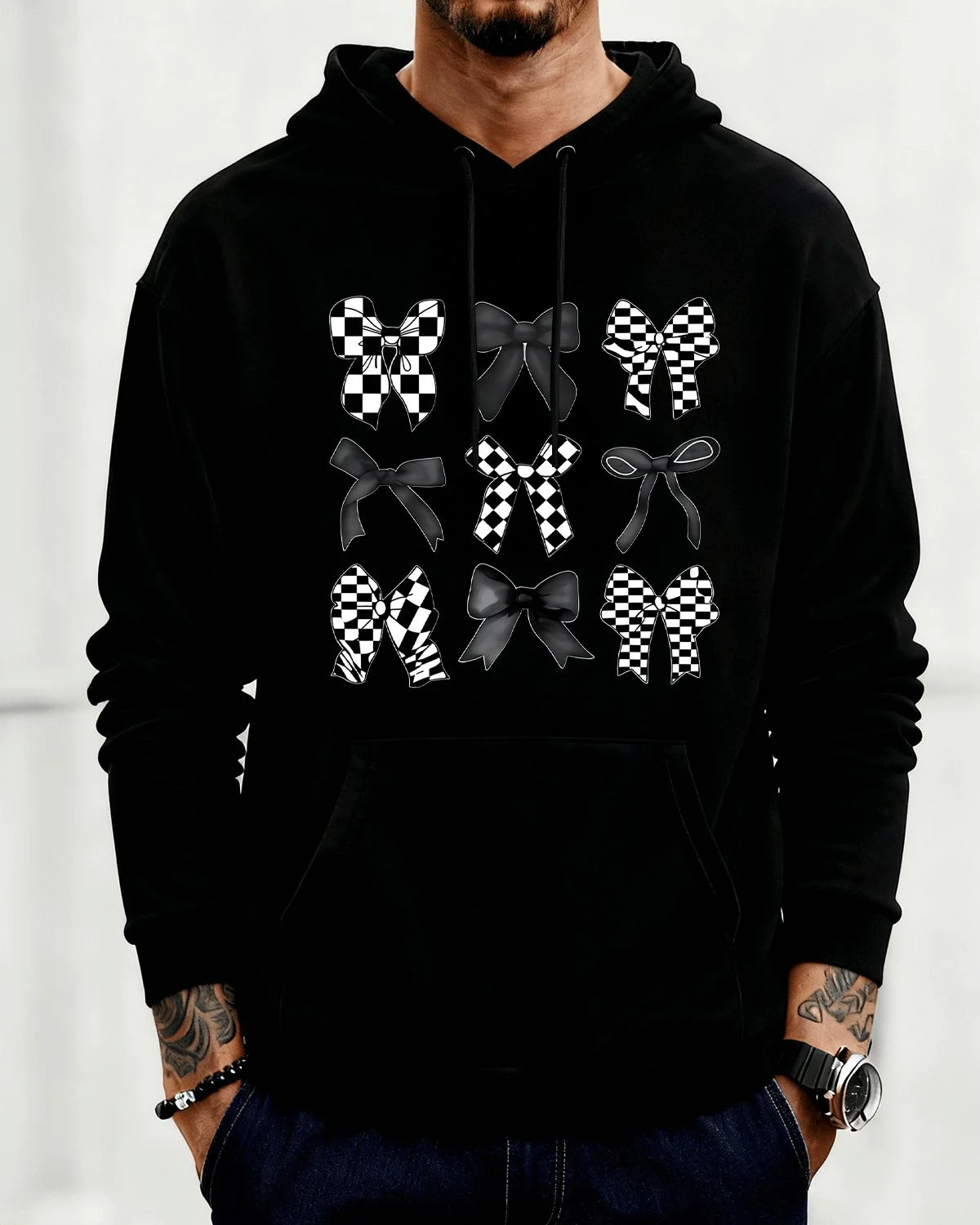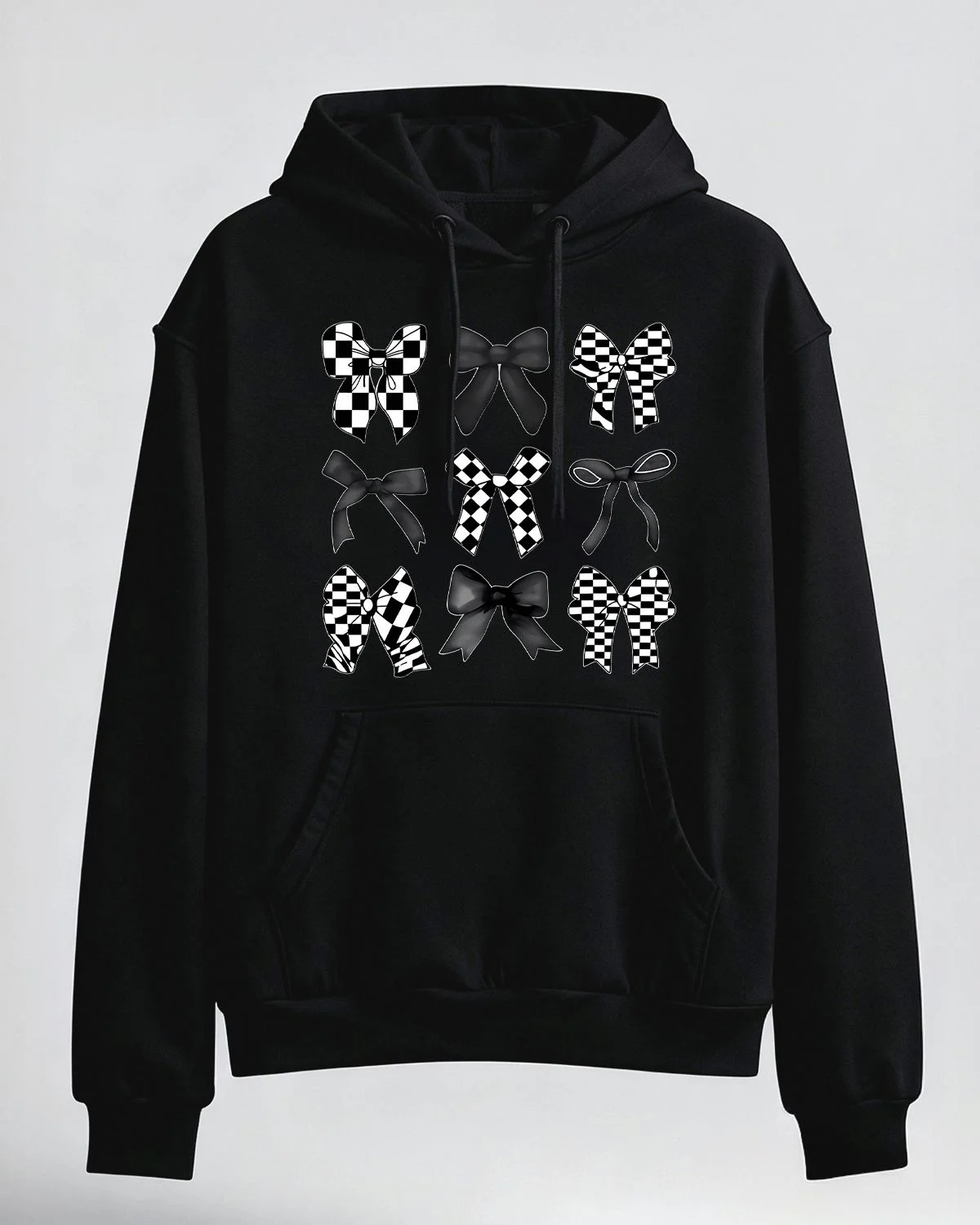 Black and White Checkered Bow Pattern Summer Cozy Graphic Hoodie-Trendy Vintage,Long Sleeve,Soft Fabric,Comfortable Fit